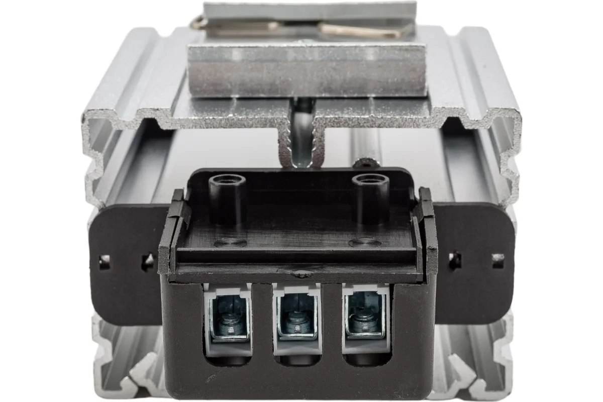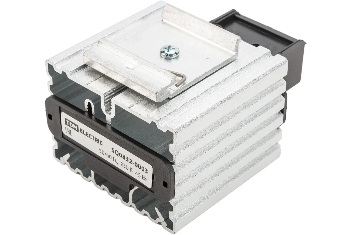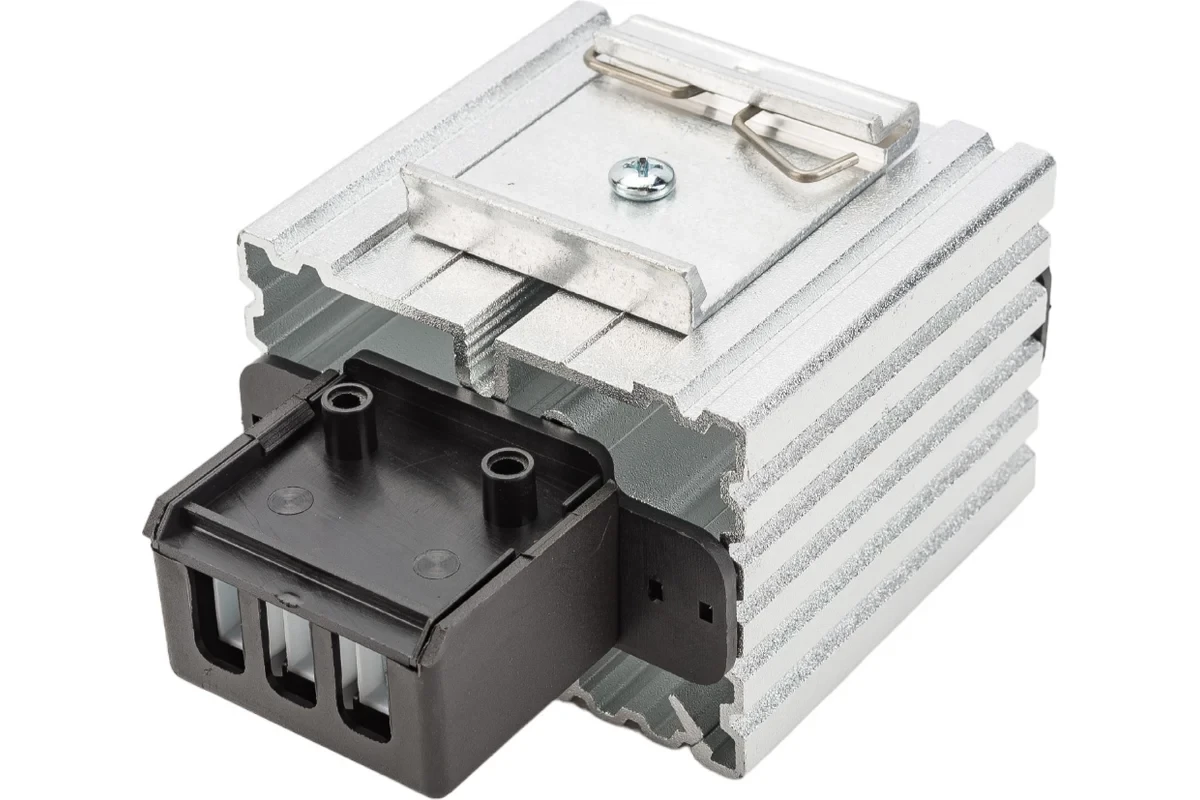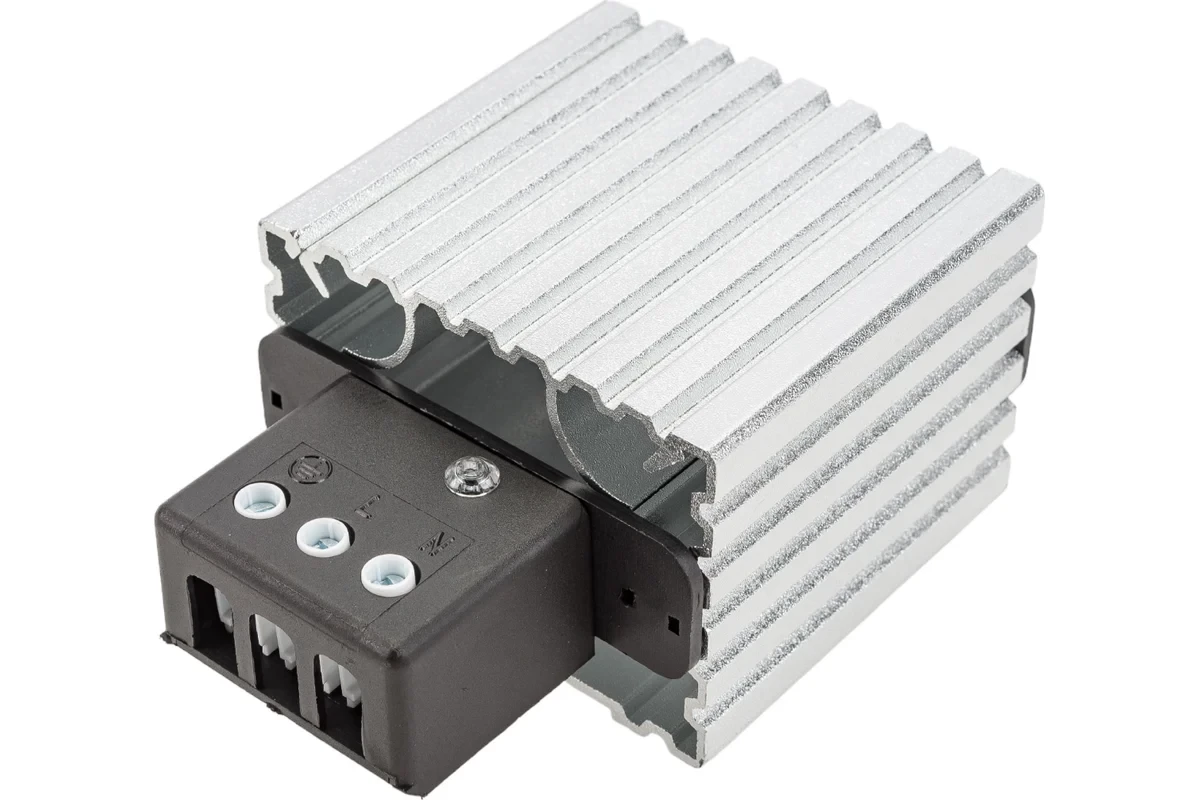 Обогреватели используются для предотвращения выпадения конденсата в шкафах при перепадах температуры, и, тем самым, препятствуют коррозии токоведущих шин и контактов устройств. Радиаторы выполнены из алюминия, покрытого термопластической массой типа UL94VO (не поддерживающей горение). Тип: обогреватель Мощность: 45 Вт Тип напряжения: AC Номинальное напряжение - 120-240 В Степень защиты IP - IP20 Тип монтажа - установка на DIN-рейку шириной 35 мм Температура эксплуатации: от -45 до +75С °С Габариты без упаковки: 109x70x60 мм Цвет: белый Нагревательный элемент представляет собой позистор (терморезистор с положительным температурным коэффициентом), электрическое сопротивление которого, а, следовательно, и потребляемая мощность, зависит от температуры поверхности (чем выше температура позистора, тем меньше потребляемая мощность). В обогревателях большой мощности используются вентиляторы для лучшего распределения выделяемого тепла. Обратная связь «сопротивление-потребляемая мощность» не допускает нагрева элементов свыше точки их переключения (2500С), обеспечивая этим полную пожарную безопасность, а также препятствует возникновению какихлибо окислительных процессов (сжигание кислорода, образование СО, выделение специфических запахов горения частиц пыли), которые нередко присутствуют на поверхности высокотемпературных ТЭНов. Специальная прямоугольная форма радиатора повышает эффективность теплообмена с нагревательным элементом, что позволяет увеличивать мощность нагревателя при небольших габаритах. Срок непрерывной работы нагревателей составляет не менее 20000 часов без изменений электронных характеристик (точка переключения, сопротивление).