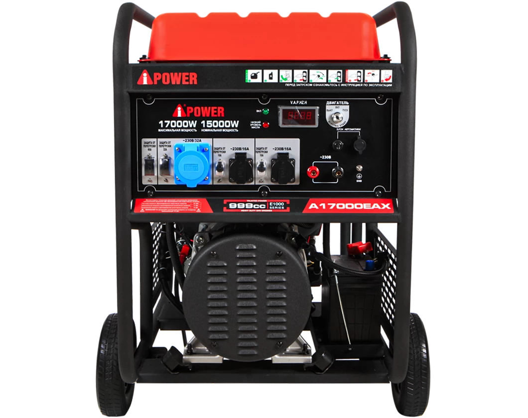 Большой бензиновый генератор мощностью 15 кВт подходит для использования в домах при постоянном проживании, а также при осуществлении строительных и других видов работ. Модель выдерживает высокие пусковые токи до 30 кВА. ХАРАКТЕРИСТИКИ Сертификат СЕ: есть Вес изделия, кг: 220 Вес в упаковке, кг: 240 Габаритные размеры упаковки, мм: 955*675*985 Габаритные размеры изделия (ДхШхВ), мм: 900*620*850 Комплектация: Генератор/Инструкция /Свечной ключ/Воронка/Вилка электрическая 2 шт./Транспортировочный комплект Уровень шума на 7 м, дБ: 84 Звуковое давление (дБ)А: 97 Класс изоляции: F Стартер: Ручной/Электро/ATS Генератор Тип контроля напряжения: AVR Максимальная мощность, кВт: 17,0 Номинальная мощность, кВт: 15,0 Пусковая мощность, кВА: 30 Сила тока, А: 65,22 Количество полюсов: 2 Коэффициент мощности (cos): 1 Класс защиты: IP23 Напряжение, В: 230 Частота, Гц: 50 Переключатель ЗИМА/ЛЕТО для АВР: Нет Количество фаз: 1 Высокие пусковые токи: Да Двигатель Серия: GB1000 Тип: 4-тактный, OHV Производитель двигателя: A-iPower Скорость вращения (макс./ном), об/мин: 3600/3000 Тип регулятора оборотов: Центробежный регулятор Мощность, кВт/л.с. при 3600 об/мин: 24кВт/33 л.с. Мощность, кВт/л.с. при 3000 об/мин: 20кВт / 27,5 л.с. Свеча зажигания: Bosch F7TC Тип топлива / класс: Бензин АИ-92 Наличие топливного фильтра: Да Материал топливного бака: Металл Тип масла, SAE: SAE 10W-30 Объем масляного картера, л: 2,5 Количество цилиндров: 2 Тип охлаждения: Воздушное Наличие топливного крана: есть Расход топлива при загрузке 75%, л / час: 7,5 Расход топлива при 100% нагрузке, л / час: 8,4 Оснащение Ручка для транспортировки: В комплекте Цифровой дисплей: Есть Выход USB: Есть Разъем для подключения автоматики: Есть Надежный альтернатор фирмы Senci обеспечивает бесперебойную работу генератора, а соответственно всех приборов, в том числе и промышленных. Его мощный 4-тактный двигатель объемом 999 куб.см OHV, с сигналом и автоматом отключения при низком уровне масла, помогает поддерживать работу вашего генератора долгие годы. Большой бензиновый топливный бак объемом 60 литров обеспечивает среднее время работы 14 часов при нагрузке 25 %. Усиленная рама с высокопрочной порошковой покраской сохранит его на долго в хорошем состоянии, даже при агрессивном использовании. На генераторе есть выход для подключения АВР, Две стандартные розетки 230В и Силовая розетка 230 В. На каждую розетку есть автомат защиты и клеммы для снятия полной мощности. Многофункциональный дисплей отображает данные о работе генератора. Генератор оснащен электростартером, позволяющим быстро и легко запускать генератор, когда вам это нужно. Генератор A-iPower идеально подходит для питания всех ваших основных бытовых приборов и техники для ремонта