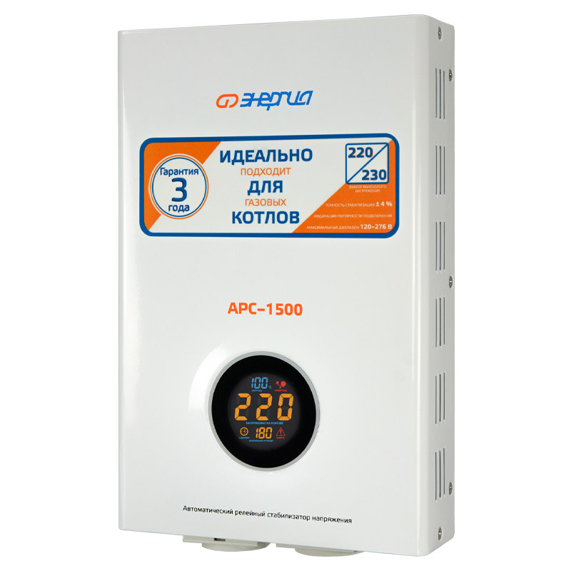 Релейный стабилизатор мощностью в 1,05-1,5 кВт / 1,5 кВА идеально подходит для применения с отопительными газовыми котлами. Работает в диапазоне входных напряжений 120-276 В с погрешностью стабилизации на выходе всего ±4 . Для фазозависимых приборов дополнительно установлена защита от неправильной полярности включения. Тип напряжения Однофазный Принцип стабилизации Релейный Мощность (кВА) 1,5 Режим работы Непрерывный Способ установки Настенный Тип охлаждения Воздушное (естественное) Дисплей Цифровой Индикация Входное напряжение, Выходное напряжение, Сеть, Защита, Задержка Подключение Вилка, розетка Колличество розеток 2 (220 В) Режим "БАЙПАС" Нет Задержка включения 6 секунд Предельный диапазон входных напряжений (В) 120-276 Рабочий диапазон входных напряжений (В) 140-260 Номинальное выходное напряжение (В) 220 Отклонение выходных напряжений ±4% Время реакции на изменение напряжения (мс) 10 Количество ступеней регулировки 4 Защита от повышенного напряжения, откл. при 276В Защита от пониженного напряжения, откл. при 120В Защита от перегрева трансформатора, откл. при 120 °С Защита от перегрузки по току Автоматический выключатель Защита от неправильной полярности включения Для фазозависимых приборов Степень защиты от внешних воздействий по ГОСТ 14254-96 IP20 Температура эксплуатации (°С) -5...+40 Температура хранения (°С) -40...+45 Относительная влажность (%) 85 КПД при полной нагрузке (%) 98 Габаритные размеры (мм) 320х200х72 Вес (кг) 5 Гарантия 12 месяцев Расчетный срок службы 10 лет Применение Для котла