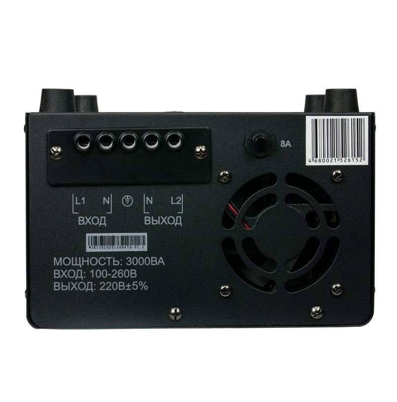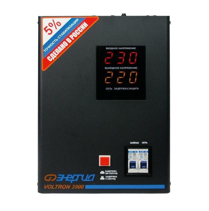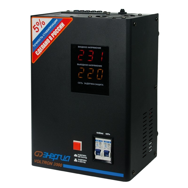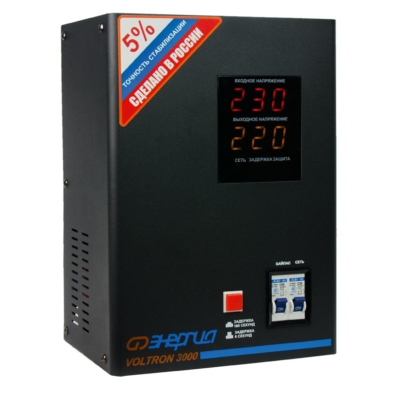 Энергия Voltron 3000 HP - релейный стабилизатор высокой точности, погрешность выходного напряжения которого, не превышает 5 от номинала 220 вольт. Стабилизирует в очень большом диапазоне входных напряжений 105В-265В предельные 95В-280В . Достаточно компактный с универсальным монтажом и на плоскую поверхность, и на стену. Тип напряжения: Однофазный Принцип стабилизации: Релейный Мощность (кВА): 3 Максимальный ток (А): до 13,6 Режим работы: Непрерывный Способ установки: Напольный, Настенный Тип охлаждения: Воздушное (конвекционное и принудительное) Дисплей: Цифровой Индикация: Входное напряжение, Выходное напряжение, Сеть, Защита, Задержка Подключение: Клеммная колодка Режим "БАЙПАС": Есть Задержка включения: 6 секунд, 180 секунд Предельный диапазон входных напряжений (В): 95-280 Рабочий диапазон входных напряжений (В): 105-265 Номинальное выходное напряжение (В): 220 Отклонение выходных напряжений: ±5% Время реакции на изменение напряжения (мс): 10 Защита от повышенного напряжения, откл. при: 280В Защита от пониженного напряжения, откл. при: 95В Защита от перегрева трансформатора, откл. при: 120 °С Защита от перегрузки по току: Автоматический выключатель Степень защиты от внешних воздействий по ГОСТ 14254-96: IP20 Температура эксплуатации (°С): -30...+40 Температура хранения (°С): -40...+45 Относительная влажность (%): 95 КПД при полной нагрузке (%): 98 Габаритные размеры (мм): 220х135х310 Вес (кг): 8,4 Вес брутто (кг): 9,5