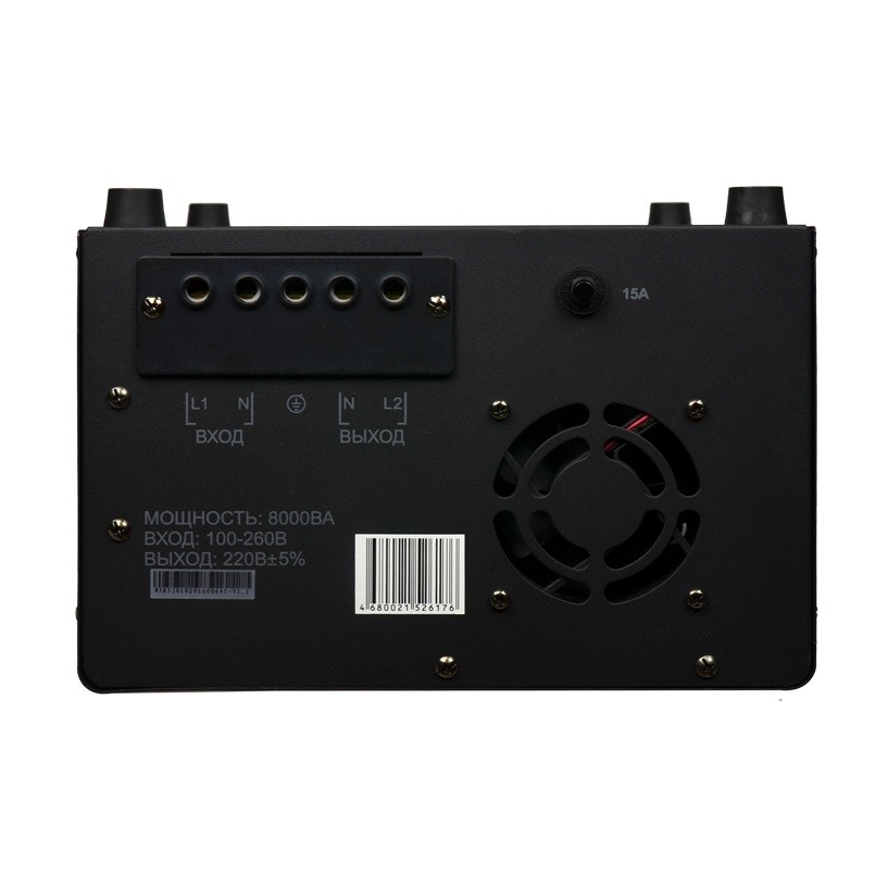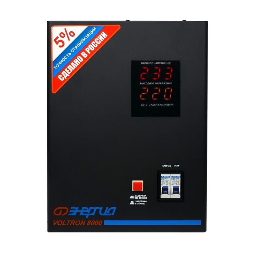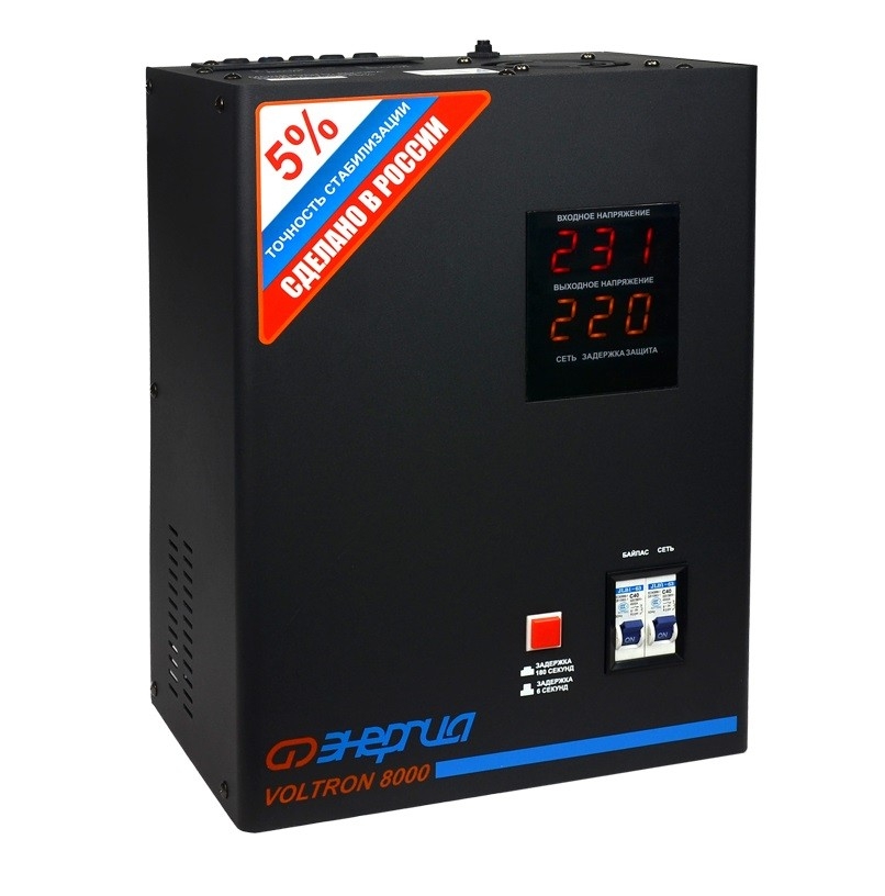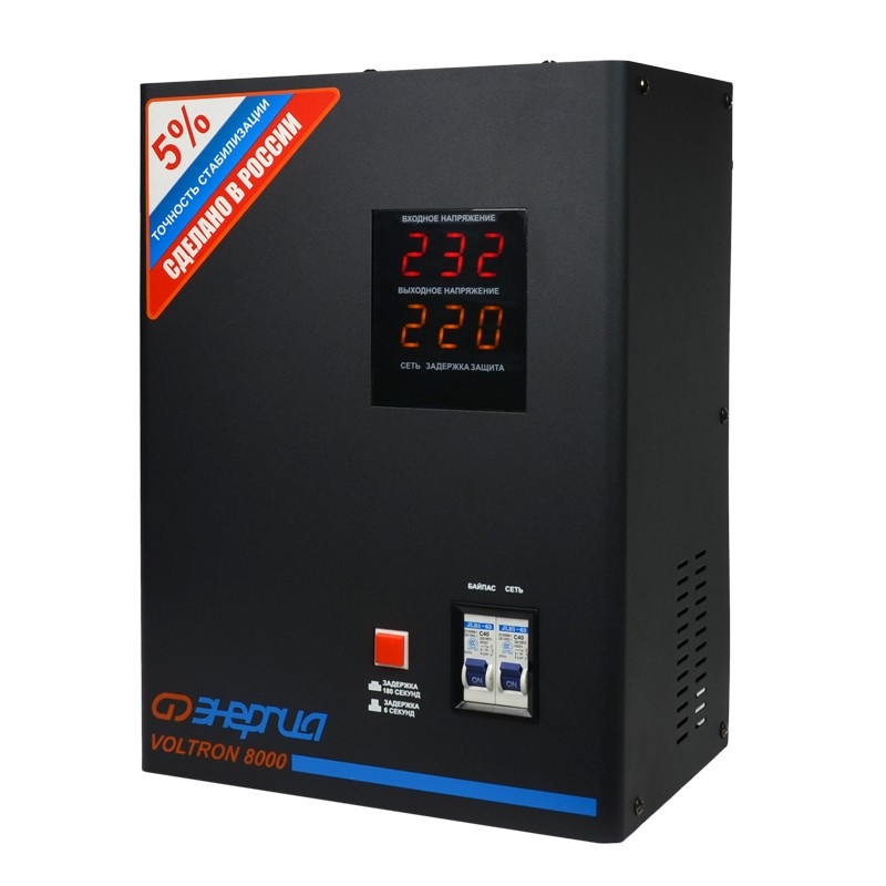 Энергия Voltron 8000 HP - высокоточный стабилизатор, с отклонением выходного напряжения от номинального значения 220 В не превышающим ±5 . Благодаря такому показателю, Вольтрон 8000 НР способен обеспечить надежную защиту от перепадов напряжения, бытовым, высокочувствительным электроприборам, таким как, насосное и отопительное оборудование, мойки высокого давления и др. Тип напряжения: Однофазный Принцип стабилизации: Релейный Мощность (кВА): 8 Максимальный ток (А): до 36 Режим работы: Непрерывный Способ установки: Напольный, Настенный Тип охлаждения: Воздушное (конвекционное и принудительное) Дисплей: Цифровой Индикация: Входное напряжение, Выходное напряжение, Сеть, Защита, Задержка Подключение: Клеммная колодка Режим "БАЙПАС": Есть Задержка включения: 6 секунд, 180 секунд Предельный диапазон входных напряжений (В): 95-280 Рабочий диапазон входных напряжений (В): 105-265 Номинальное выходное напряжение (В): 220 Отклонение выходных напряжений: ±5% Время реакции на изменение напряжения (мс): 10 Защита от повышенного напряжения, откл. при: 280В Защита от пониженного напряжения, откл. при: 95В Защита от перегрева трансформатора, откл. при: 120 °С Защита от перегрузки по току: Автоматический выключатель Степень защиты от внешних воздействий по ГОСТ 14254-96: IP20 Температура эксплуатации (°С): -30...+40 Температура хранения (°С): -40...+45 Относительная влажность (%): 95 КПД при полной нагрузке (%): 98 Габаритные размеры (мм): 360х270х175 Вес (кг): 15,8