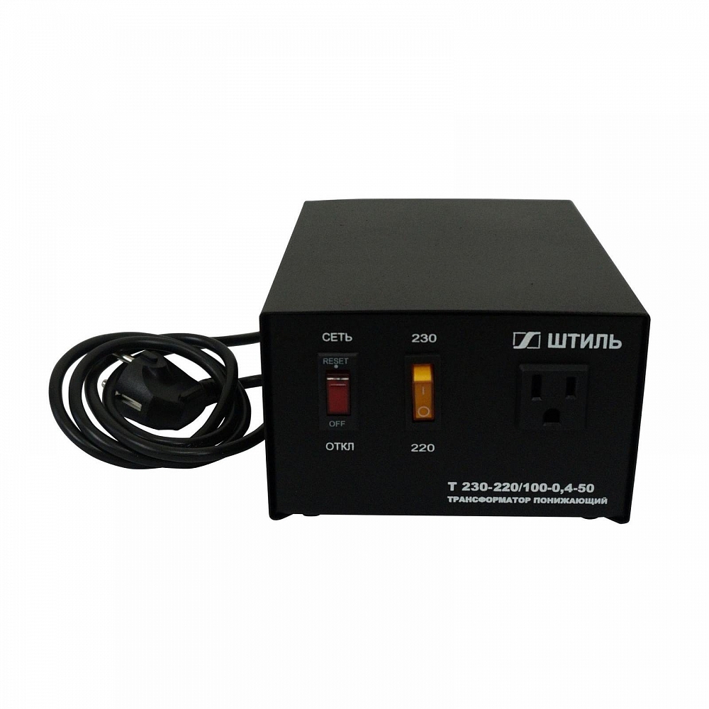 Понижающие трансформаторы «Штиль» предназначены для электропитания приборов, аппаратуры и устройств переменным током напряжением 100 В от стандартной электросети с напряжением 220 В или 230 В. Модель: Т 230-220/100-0,4-50 Максимальная мощность нагрузки, кВА: 0,4 Входное напряжение, В: 230, 220 (±10%) Диапазон выходного напряжения, В: 100 Частота, Гц: 50 Максимальный выходной ток, А: 4 КПД, %: 95 Длина провода, м: 1,4 Размер без упаковки (ШхВхГ), мм: 145x95x190 Размер в упаковке (ШхВхГ), мм: 160x130x223 Масса, кг: 5 Масса в упаковке, кг: 5,4 Эти изделия содержат в своем составе трансформаторы, обеспечивающие гальваническую развязку цепи нагрузки от питающей сети. Такой трансформатор выполняет функцию фильтра импульсных помех, возникающих в питающей сети. Основное назначение новых изделий питание аппаратуры высококачественного звуковоспроизведения с номинальным напряжением 100 В. Данные модели разработаны по просьбам аудиофилов. Изделие представляет собой понижающий однофазный преобразователь напряжения, состоящий из следующих основных частей: металлический корпус, понижающий трансформатор на тороидальном сердечнике, автоматический выключатель "СЕТЬ", переключатель "220-230 В", позволяющий выбрать напряжение сети, одна розетка американского стандарта для подключения нагрузки на 100 Вольт, сетевой шнур с евровилкой. Трансформаторы «Штиль» могут быть использованы для электропитания зарубежной аппаратуры, рассчитанной на электропитающую сеть 50/60 Гц 100 В.