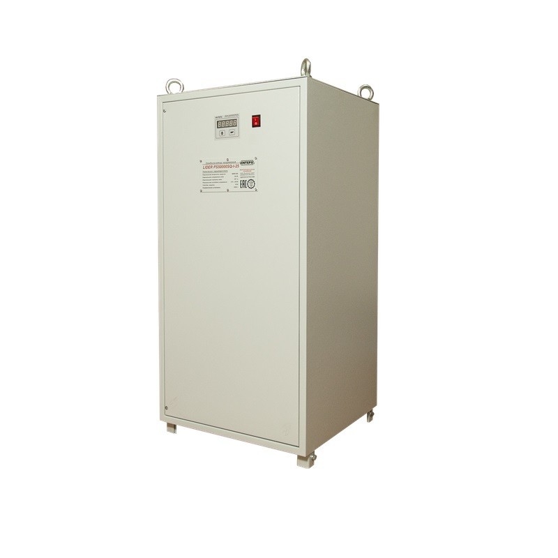 Промышленный стабилизатор Lider PS50000SQ-I мощностью 50000 ВА расчитан на подключение к нему любого промышленного и бытового оборудования мощностью до 50 кВт. Он может обеспечить стабильным напряжением несколько домов или коттеджей или станки и другое оборудование. Присоеденение электропотребителей осуществляется к контактам автоматического выключателя. Входные и выходные параметры PS50000SQ-I-15 Номинальное напряжение сети, В 220 Частота питающей сети, Гц 50 Рабочий диапазон входного напряжения, В 155...275 Номинальный диапазон входного напряжения, В 180...265 Максимальный ток, потребляемый из сети при изменении входного напряжения в номинальном диапазоне при номинальной нагрузке, А 277,8 Номинальное выходное напряжение, В 210...230 Точность стабилизации выходного напряжения при изменении входного в номинальном диапазоне, % ±0,9 Номинальная мощность нагрузки, ВА / ток нагрузки, А 50000 / 227,3 Изменение нагрузки, % от номинальной 0100 Масса, не более, кг 160 Эксплуатационные характеристики Перегрузочная способность при Рнагр. 1,1Рном.10сек. при Рнагр. 1,5 Рном. 5 сек. при Рнагр. 2 Рном. 1 сек. при Рнагр. 4 Рном. 10 мсек. КПД, не менее 0,97 Форма выходного напряжения не вносит искажений Отклик на возмущение, мс не более 40 Скорость реакции на возмущение сети, В/с не менее 250 Уровень шума, дБ не более 40 Влажность, % не более 80, при 25° С Диапазон рабочей температуры, °С от -40 до +40 Габариты, Ш х Г х В, мм 550х450х985 Индикация и сигнализация Индикация на светодиодном пятиразрядном цифровом дисплее: - мощности нагрузки - величины входного и выходного напряжения - температура силовых элементов - аварий стабилизатора и сети Контроль и защита - контроль температуры силовых элементов; - контроль тока нагрузки; - отключение потребителя при перегрузке с однократным повторным автоматическим включением через 10 секунд; - быстродействующая защита от короткого замыкания (не более 10 мсек) - автоматический вводной выключатель с тепловым и электромагнитным расцепителем Класс защиты IP20 Установка напольная