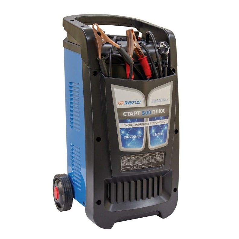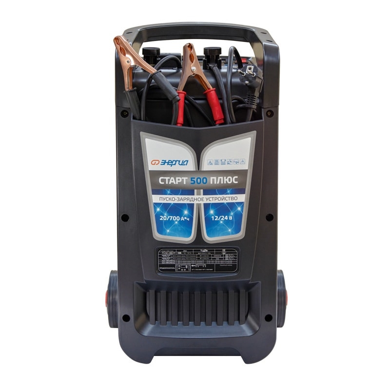 Трансформаторное пускозарядное устройство «Энергия СТАРТ 500 ПЛЮС» предназначено для эффективной зарядки всех типов свинцово-кислотных аккумуляторных батарей, а также для запуска двигателя. Пуско-зарядное устройство имеет несколько режимов зарядки батарей. Напряжение питания (В): 220±15% Номинальная частота переменного тока (Гц): 50/60 Максимальная мощность (Вт) (при 12/24В): 1200 Номинальное напряжение АКБ (В): 12/24 Максимальный зарядный ток (А): 70 Максимальный пусковой ток (при 12/24 В): 220/400 Номинальная емкость подключаемых батарей (А*ч): 30-700 Диапазон рабочих температур (°С): -10...+40 Переключатель режимов заряда АКБ: Есть Предпусковая подготовка: Нет Режим запуска двигателя: Есть Таймер времени заряда: Нет Охлаждение: Конвекционное Типы заряжаемых АКБ: С абсорбированным электролитом (AGM / С гелеобразным электролитом (GEL) / С жидким электролитом (WET) Тип зарядного устройства: Трансформаторное Встроенные средства защиты: Короткое замыкание / Неправильная полярность / Перегрев / Перегрузка Степень защиты по IP: 215 Габаритные размеры (мм): 600х290х270 Вес (кг): 19,4 Особенности Зарядка аккумуляторных батарей и запуск двигателя; Защита от перегрузки и перегрева, короткого замыкания и неправильной полярности; Карман для хранения проводов; Удобные колеса для транспортировки.
