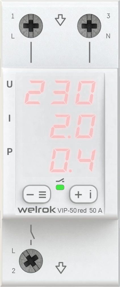 50 А (max 60 A), 11 000 ВА Многофункциональное реле Welrok VIP-50 Red защищает оборудование от скачков и провалов напряжения, последствий обрыва нулевого провода и превышения тока или полной мощности. Реле отключает нагрузку, если напряжение, ток или мощность выходит за установленные пределы и автоматически включает нагрузку, когда значение параметра вернется в норму. 3 дополнительных преимущества, которые дает контроль по току в реле: 1. Возможность точного ограничения мощности нагрузки; 2. Возможность равномерно распределить нагрузку по фазам; 3. Визуальный контроль за текущим состоянием нагрузки. Максимальная функциональность Welrok VIP компактное реле на 2 модуля с мощным функционалом и корпусом, не поддерживающим горение: ● Позволяет выбрать, по какому из параметров ток или мощность будет срабатывать защита вместе с защитой по напряжению. ● Скорость срабатывания реле не более 0,03 сек. ● TrueRMS для точного измерения напряжения Для уменьшения количества срабатываний: ● Защита от частых срабатываний ● Регулируемый гистерезис ● Регулируемая задержка включения нагрузки ● Профессиональная модель отключения при выходе напряжения за пределы Для анализа питающей сети по характеру аварийных срабатываний: ● Энергонезависимый журнал срабатываний на 100 значений Для комфортной и безопасной эксплуатации: ● Поправка напряжения и тока на экране ● Регулировка яркости экрана ● Защита от перегрева ● Блокировка кнопок ● Сохранение настроек в энергонезависимой памяти Простая установка и удобное управление Реле отображает три параметра сети одновременно. Реле подключается без транзита нуля. Настройка реле осуществляется с помощью двух кнопок: « ➖ » « ☰ » (меню) и « ➕ » « ℹ️ ». Отличие Welrok VI от Welrok VIP