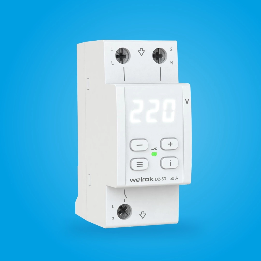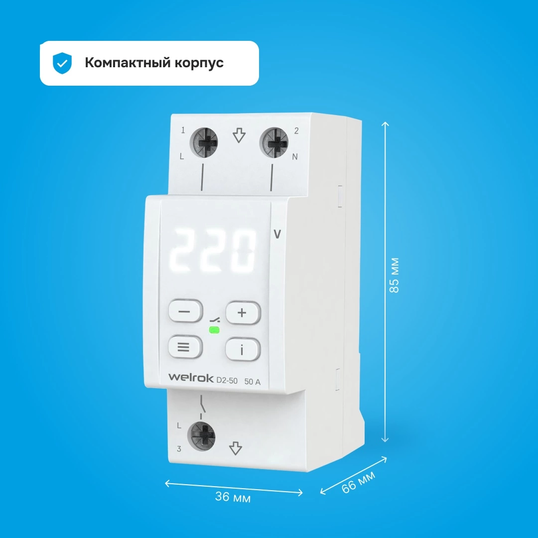 50 А (max 60 A), 11 000 ВА50 А (max 60 A), 11 000 ВА Реле напряжения Welrok D2 защищает оборудование от скачков и провалов напряжения, обрыва нулевого провода. Реле отключает нагрузку, если сетевое напряжение выходит за установленные пределы. Когда значение напряжения вернется в норму, нагрузка будет автоматически включена обратно. Гарантия 10 лет Максимальная функциональность Welrok D2 компактное реле на 2 модуля с мощным функционалом: ● Скорость срабатывания реле < 0,03 сек. ● TrueRMS для точного измерения напряжения Для уменьшения количества срабатываний: ● Защита от частых срабатываний ● Регулируемый гистерезис ● Регулируемая задержка включения нагрузки ● Профессиональная модель отключения при выходе напряжения за пределы Степень защиты по ГОСТ 14254: IP20 Для анализа питающей сети по характеру аварийных срабатываний: ● Журнал срабатываний на 100 значений Для комфортной и безопасной эксплуатации: ● Поправка напряжения на экране ● Регулировка яркости экрана ● Защита от перегрева Корпус реле напряжения изготовлен из пластика, не поддерживающего горение. Простая установка и удобное управление Подключение можно сделать с транзитом или без транзита нуля через Welrok D2.При этом вход нуля может быть как вверху так и внизу реле. Настройка реле осуществляется с помощью трех кнопок: « ☰ » (меню) и « ➖ », « ➕ ». Чтобы увидеть журнал аварийных срабатываний, достаточно нажать кнопку « ℹ️ » .Характеристики Номинальный ток, А: 50 Управление: кнопочное Гарантийный срок, лет: 10 Серия: D2 Цвет индикатора: белый Способ монтажа: на DIN-рейку Номинальная мощность нагрузки для категории АС-1: 11 000 ВА Пределы напряжения: верхний 220280 В; нижний 120210 В Время отключения при превышении напряжения: не более 0,03 с Время отключения при понижении: 0,110 c (> 120 В); не более 0,03 с (< 120 В) Напряжение питания: не менее 100 В; не более 420 В Энергопотребление: не более 0,35 кВт*ч / мес Количество коммутаций под нагрузкой / без нагрузки: не меньше 10 000 циклов / не меньше 500 000 циклов Тип реле: поляризованное Подключение: не более 16 мм² Масса / габаритные размеры (ш × в × г): 0,17 кг ±10 % / 36 х 85 х 66 мм