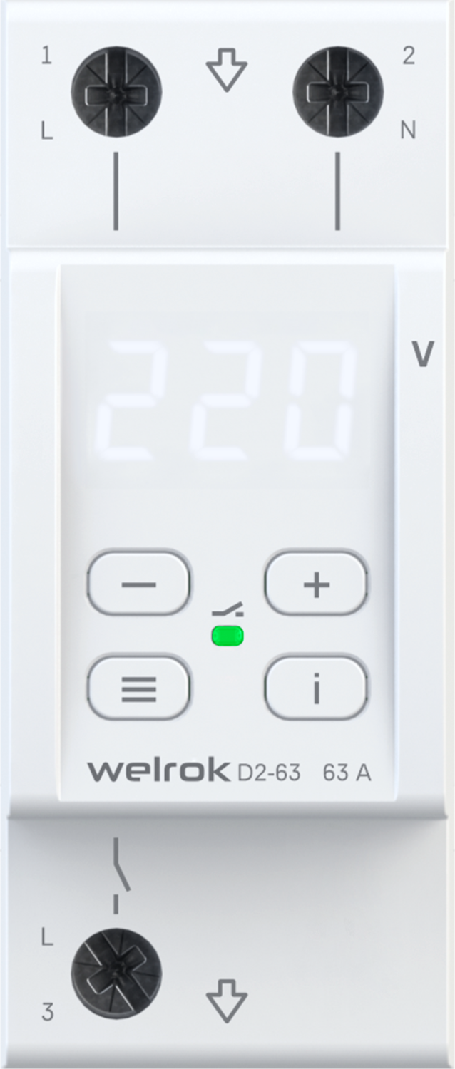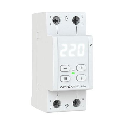 63 А (max 80 A), 13 900 ВА63 А (max 80 A), 13 900 ВА Реле напряжения Welrok D2 защищает оборудование от скачков и провалов напряжения, обрыва нулевого провода. Реле отключает нагрузку, если сетевое напряжение выходит за установленные пределы. Когда значение напряжения вернется в норму, нагрузка будет автоматически включена обратно. Гарантия 10 лет На все реле напряжения Welrok действует 10-летняя гарантия от производителя. Максимальная функциональность Welrok D2 компактное реле на 2 модуля с мощным функционалом: ● Скорость срабатывания реле < 0,03 сек. ● TrueRMS для точного измерения напряжения Для уменьшения количества срабатываний: ● Защита от частых срабатываний ● Регулируемый гистерезис ● Регулируемая задержка включения нагрузки ● Профессиональная модель отключения при выходе напряжения за пределы Для анализа питающей сети по характеру аварийных срабатываний: ● Журнал срабатываний на 100 значений Для комфортной и безопасной эксплуатации: ● Поправка напряжения на экране ● Регулировка яркости экрана ● Защита от перегрева Корпус реле напряжения изготовлен из пластика, не поддерживающего горение. Простая установка и удобное управление Подключение можно сделать с транзитом или без транзита нуля через Welrok D2.При этом вход нуля может быть как вверху так и внизу реле. Настройка реле осуществляется с помощью трех кнопок: « ☰ » (меню) и « ➖ », « ➕ ». Чтобы увидеть журнал аварийных срабатываний, достаточно нажать кнопку « ℹ️ ».