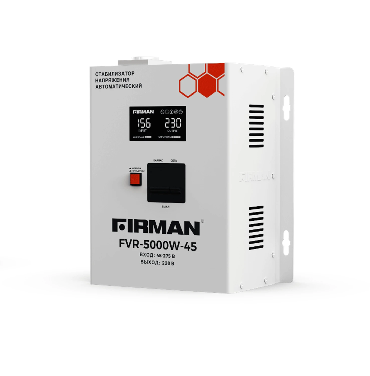 Однофазный стабилизатор напряжения FIRMAN FVR-10000W-45 релейного типа – это надежное и высокоэффективное устройство, которое прошло строгий контроль качества на всех этапах производства и обеспечивает стабильное электропитание в вашем доме или офисе.: Напряжение: однофазный, Мощность: 4000 Вт / 5000 ВА, Диапазон работы: 45-275В Точность вых. напряжения: 220 +/- 10%, Принцип работы: сервоприводный, Установка: настенный;; Цифровой дисплей: да, Подключение: клеммная колодка. Стабилизатор обладает всеми необходимыми функциями и системами защиты, которые гарантируют безопасную и комфортную эксплуатацию как для вас, так и для подключаемых потребителей широкого спектра электрических нагрузок.