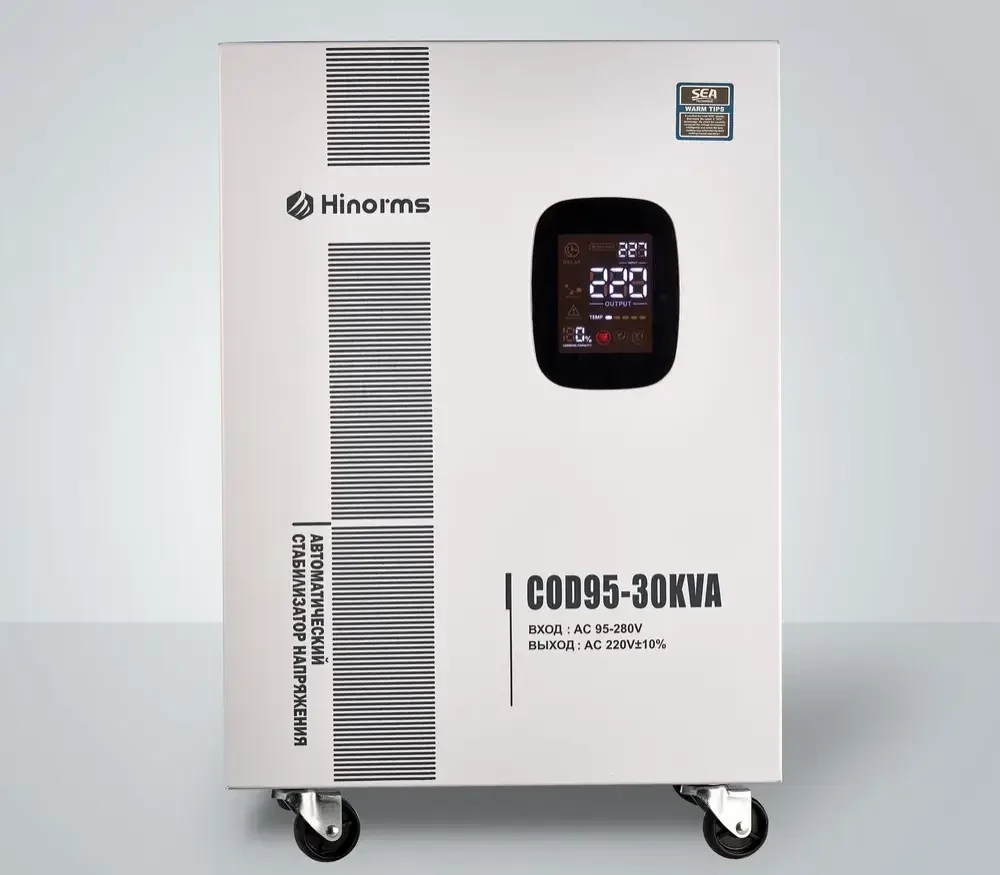 Стабилизаторы напряжения релейного типа Hinorms серии COD90 - это отличное решение для защиты бытового оборудования от некачественного напряжения в сети: широкий диапазон работы, информативный дисплей, симпатичный дизайн, настенно - напольное размещение и главное низкая цена и высокое качество! Тип напряжения: Однофазный Принцип стабилизации: Релейный Мощность: 30000 ВА Входное напряжение: 90 - 270 В Выходное напряжение: 220V ± 10% Частота: 50/60 Гц Трансформатор: тороидальный КПД при полной нагрузке: 97% Задержка включения: короткий 3-5 сек, длинный 3-7 мин. Защита: от перенапряжения, перегрузки, высокой температуры, короткого замыкания Тип дисплея: светодиодный цифровой дисплей (входное и выходное напряжение, избыточное и низкое напряжение, перегрузка, задержка, температура) Тип охлаждения: Воздушное (конвекционное и принудительное) Температура эксплуатации: -20...+45°С Относительная влажность: 90% Режим работы: Непрерывный Способ установки: Напольный Размер в коробке 50.5*47*67 см, без коробки 41.5*45*52.2 см. Вес брутто 60.5 кг, нетто 50 кг. Отличаются высокой скоростью и широким диапазоном регулирования напряжения, особенно не заменимы при эксплуатации в проблемных сетях не имея аналогов среди конкурентов. Устройство оснащено самыми современными технологиями, такими как интеллектуальная система цифрового дисплея, которая обеспечивает спокойствие, защита от перегрузки для защиты кондиционера в нестабильные периоды и т. д. Более того, энергоэффективность стильных и инновационных стабилизаторов может достигать более 97%, что может удовлетворить все Ваши потребности.