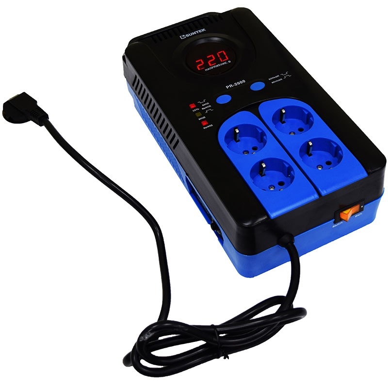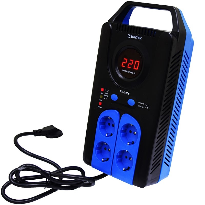 SUNTEK PR-2000ВА российский стабилизатор напряжения релейного типа. Предназначен для обеспечения стабильного напряжения для нагревательного котла, компьютерной и аудио-видеотехники. Тип стабилизирования: релейный Универсальный пластиковый корпус (навесной и напольный) Цифровой дисплей 4 Евророзетки и еврошнур с заземляющ. контактами Широкий рабочий диапазон (120-285 Вольт) Мгновенное время отклика на изменение входного напряжения Высокая точность стабилизации ( до 5%) Задержка 3сек 180 сек (устанавливается вручную) Анализ входного напряжения в любой момент времени Анализ границ рабочего диапазона Защита от короткого замыкания Защита от перегрузки (перегрева) Защита от пониженного напряжения Защита от повышенного напряжения Защита от импульсных (грозовых) разрядов Длина X Ширина X Высота, см - 26x14x8 Вес, кг - 6 Особенности: работает в широком диапазоне входных напряжений (120285 В); мгновенно реагирует на изменение параметров сети; имеет многоступенчатую систему защиты (от короткого замыкания, от перегрузки, от пониженного/повышенного напряжения); оснащён четырьмя розетками для подключения нагрузки (все розетки со стабилизацией) и информативным цифровым дисплеем. Применение: стабилизатор может использоваться в загородных домах, коттеджах, дачах для питания нескольких крупных бытовых приборов, в гаражах и мастерских для станков, компрессоров и электроинструмента, требующего до 2000 Вт, в офисах и домашних рабочих зонах для нескольких компьютеров, оргтехники, систем бесперебойного питания.