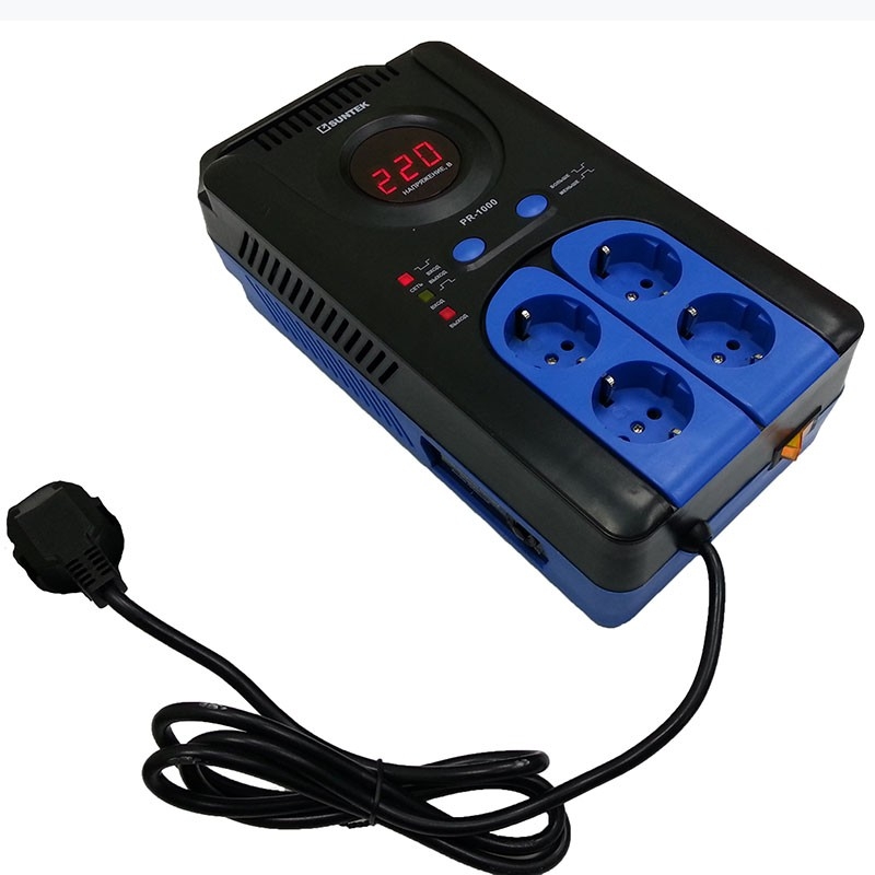 Стабилизатор напряжения SUNTEK серии PR, выполнен в современном корпусе, выполненный из неаллергенного материала, который гармонично впишется в Ваш интерьер. Универсальный пластиковый корпус (навесной и напольный) Тонкий! Всего 8 см! Микроконтроллер HT46R47 компании Holtek Цифровой дисплей 4 Евророзетки и еврошнур с заземляющ. контактами Широкий рабочий диапазон (120-285 Вольт) Мгновенное время отклика на изменение входного напряжения Высокая точность стабилизации ( до 5%) Задержка 3сек 180 сек (устанавливается вручную) Анализ входного напряжения в любой момент времени Анализ границ рабочего диапазона Защита от короткого замыкания Защита от перегрузки (перегрева) Защита от пониженного напряжения Защита от повышенного напряжения Защита от импульсных (грозовых) разрядов Гарантия 3 года (1 год полного и 2 года бесплатного сервисного обслуживания) На передней панели стабилизатора напряжения SUNTEK PR 500, расположилось цифровое табло, которое имеет возможность информировать потребителя о входном, выходном напряжении, о перегрузке или перегреве. Кнопка "больше/меньше" позволяет выбрать нужную Вам задержку включения стабилизатора напряжения - 3 или 180 секунд. Также на передней панели расположены 4 розетки, для включения потребителей. Обращаем Ваше внимание, что суммарная нагрузка на всех розетках не должна превышать номинал стабилизатора напряжения! На боковой стороне находится предохранитель, который защищает от короткого напряжения и длительного перегруза. Стабилизатор включается в розетку проводом длиной 120 см. Такой длины провода достаточно чтобы стабилизатор мог обеспечивать подключение нескольких удаленных приборов. Стабилизатор напряжения SUNTEK PR 500 диапазоне 140-270 Вольт работает полноценно полностью выравнивает напряжения на уровень допустимый ГОСТом без потери мощности! Табло показывает выходное напряжения 220 Вольт. Если, в результате дальнейшего падения напряжения (а это в диапазоне 120-140 Вольт), выходное напряжение становится меньше допустимого ГОСТом РФ, то уже табло показывает какое именно напряжение выходит из стабилизатора. При входном напряжении меньше 120 Вольт на табло загорается буква "L", но какое-то определенное время еще поступает напряжение на выход стабилизатора. Стабилизатор будет работать даже от 70 Вольт, но надо понимать, что уровень загрузки его тогда должен быть меньше номинала и выходное напряжение будет меньше ГОСТа, свои полноценные характеристики стабилизатор начинает выполнять со 120 Вольт. При напряжении в дипазоне 270-285 Вольт также на табло будет показываться реальное напряжение на выходе. Но при достижении 285-288 Вольт стабилизатор сразу выключится отключив все приборы (на табло буква "H"). Это сделано, потому что выходное напряжение уже будет высоким и опасным для техники. Электронный блок релейного стабилизатора SUNTEK напряжения представляет собой достаточно мощный микроконтроллер, в котором происходит анализ входного и выходного напряжения и вырабатываются сигналы для управления ключами стабилизатора. При формировании управляющего напряжения микроконтроллер учитывает время срабатывания ключей и силовых реле. Это позволяет производить переключения без разрывов. В результате форма напряжения на выходе релейного стабилизатора повторяет форму на входе. Стабилизатор напряжения SUNTEK будет Вашим индикат
