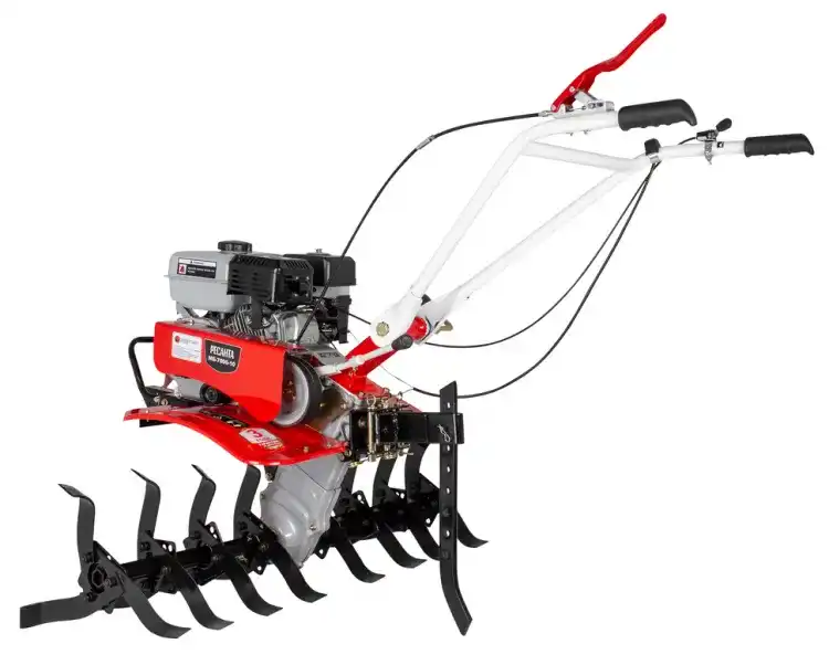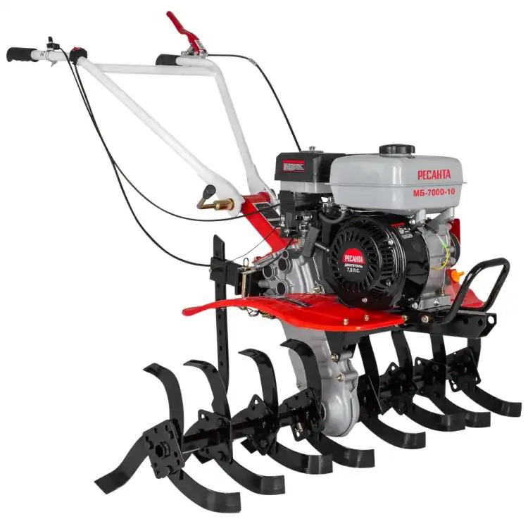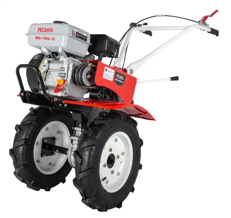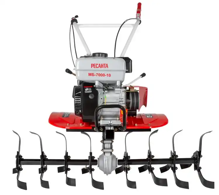 Модель мотоблока МБ-7000P-10 Ресанта используется для проведения работ на участках небольших фермерских и приусадебных участках. Мотоблок оснащён надёжным бензиновым 4-тактным, одноцилиндровым, двигателем, мощность которого составляет 7 л.с. и стальными закалёнными фрезами, что позволяет справляться с любыми почвами. Воздушный фильтр с масляной ванной обеспечивает устойчивую работу в условиях сильной запылённости. Корпус редуктора сделан из алюминия, тип редуктора: шестеренчато-цепной. Объём топливного бака 3.6 л. Расход топлива 375 гр/кВт в час. Ширина обработки 100см. Диаметр фрез: 30 см, глубина обработки регулируется сошником. Тип двигателя 4Т одноцилиндровый, бензиновый Мощность, л.с. 7 Тип редуктора Шестерёнчато-цепной Ступица Шестигранник 23 мм Тип колес 4х10 Тип привода активной навески Ременный Корпус редуктора Алюминиевый Расход топлива, гр/кВт в час 375 Передачи 2 вперед / 1 назад Пониженная первая передача Нет Разблокировка дифференциала Нет Электростартер Нет Тип воздушного фильтра С масляной ванной Ширина обработки, см 100 Диаметр фрез, см 30 Объем топливного бака, л 3.6 Габариты упаковки 640 × 640 × 640 Вес, кг 60 кг