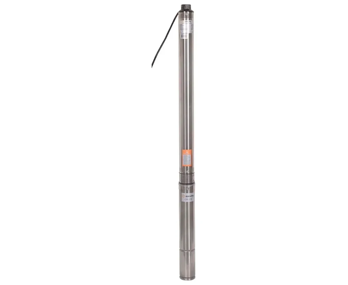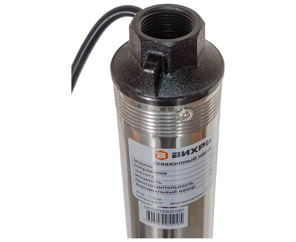 Скважинный насос СН-115 Вихрь это надежное решение для организации водоснабжения в бытовых условиях. Он предназначен для подачи воды из глубоких скважин, максимальная глубина погружения устройства составляет 60 м. Мощность, Вт: 1200 Напряжение питающей сети, В: 220-230 Частота питающей сети, Гц: 50 Максимальная высота подъема воды, м: 115 Температура воды, °С: +35 Максимальная производительность, л/мин: 50 Степень защиты: IPX8 Максимальная глубина погружения насоса, м: 60 Диаметр выходного отверстия, дюйм: 1 Содержание песка не более, г/м³: 180 Диаметр, мм: 75 Длина кабеля, м: 65 Материал насосной части: Пластик Вес нетто, кг: 18.08 кг Насос обладает мощностью 1200 Вт и способен создавать напор до 115 м, обеспечивая производительность до 50 л/мин, что удовлетворяет потребности большинства пользователей. Диаметр выходного отверстия насоса 1 дюйм, а длина кабеля 65 метров, это обеспечивает удобство подключения и эксплуатации на значительной глубине. Скважинный насос СН-115 Вихрь рассчитан на работу с водой, содержащей не более 180 г/м³, что расширяет область применения насоса. Насосная часть выполнена из прочного пластика, который обеспечивает легкий вес и устойчивость к коррозии. Компактный диаметр корпуса (75 мм) позволяет легко устанавливать устройство в скважины диаметром от 100 мм и более.