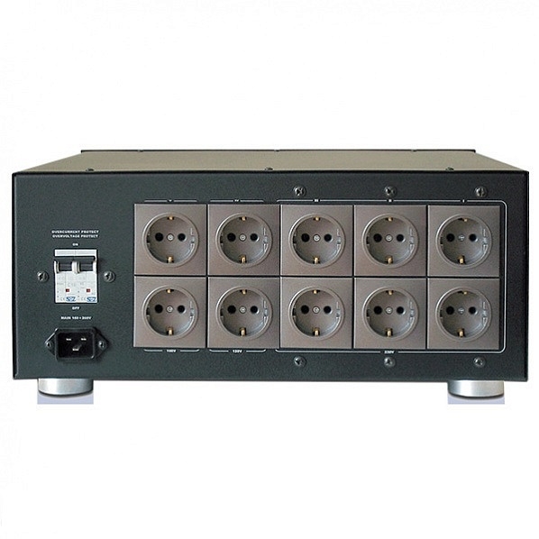 Bliss Power предназначен для обеспечения стабилизированным напряжением аудиотехники при питании от сети. Создан по принципу цифроаналогового преобразования на основе метода суммирования аналоговых величин пропорциональных весам разрядов цифрового кода, разрядные коэффициенты которых равны единице. Диапазон входных напряжений: 190-255, В Выходной ток (действующее значение): 5, не более, А Максимальный пиковый ток (действующее значение): 20, не более, А Выходное напряжение : 1-240, В (выбирается пользователем) Точность поддержания выходного напряжения: +/-1, В Частота выходного напряжения: ± 0,001, Гц 50-120 (выбирается пользователем) Максимальная мощность нагрузки: 1000, Вт Габариты: 200 х 595 х 440, мм (высота-ширина-глубина) Масса: 48, кг, не более Регенератор содержит 7 источников питания постоянного тока, величИны напряжения которых относятся как U-2U (аналогично резестивной матрице в твердотельных ЦАПах). Для управления процессом генерации напряжения используются быстродействующие ключи на полевых транзисторах. Таким образом, каждые 10 микросекунд из источников напряжения собирается часть синусоиды по заданию цифрового эталона в микропроцессоре. Следовательно, мы имеем силовой цифроаналоговый преобразователь, который выстраивает свой выходной сигнал прямо на нагрузке без промежуточных преобразований и без широтноимпульсной модуляции (не путать с усилителем класса D). Нелинейные искажения выходного сигнала не более 0,1%. Такой подход позволяет достичь высокого к.п.д. до 80%. При этом аппарат обладает довольно низким выходным сопротивлением (ниже чем сеть), так как фильтрующие емкости источников питания составляют десятки тысяч микрофарад на каждом источнике, а сопротивление полевых транзисторов, подключающих источники, измеряется в десятках мОм, индуктивное сопротивление практически отсутствует. Немаловажным преимуществом является то, что прибор является одновременно стабилизатором напряжения в диапазоне от 190 до 255 В выходной мощностью 1,1 кВт с полной гальванической развязкой от сети. Позволяет регулировать выходное напряжение от 1 до 240 В с шагом 1 В и выходную частоту от 50 до 120 Гц с шагом 1 Гц. Благотворное влияние на звук при повышении частоты питания было доказано фирмой PSAUDIO, когда она стала производить свою знаменитую линейку регенераторов с такой же функцией. Bliss Power обеспечивает: стабильное напряжение на выходе синусоидальной формы на уровне от 1В до 240В по желанию пользователя. Шаг настройки 1В; частоту генерируемого напряжения от 50Гц до 120Гц по желанию пользователя. Шаг настройки 1Гц. Стабилизация частоты кварцевая; защиту от короткого замыкания и длительного перегруза на выходе устройства; защитное отключение устройства в случае аварийного повышения напряжения в сети; работу во всём диапазоне нагрузок от холостого хода до максимальной. Bliss Power оборудован следующими защитами: - защита от аварийного входного тока отключение автоматическим выключателем; - защита от высокого входного напряжения на уровне 260В - отключение автоматическим выключателем; - защита от перегрева трансформатора и силовых ключей отключение автоматическим выключателем; - защита от перегрузки по максимальному выходному току отключение напряжения на выходе; - защита от тепловой перегрузки транзисторов; В режиме запуска нагрузки ток ограничивается на уровне 20 А (