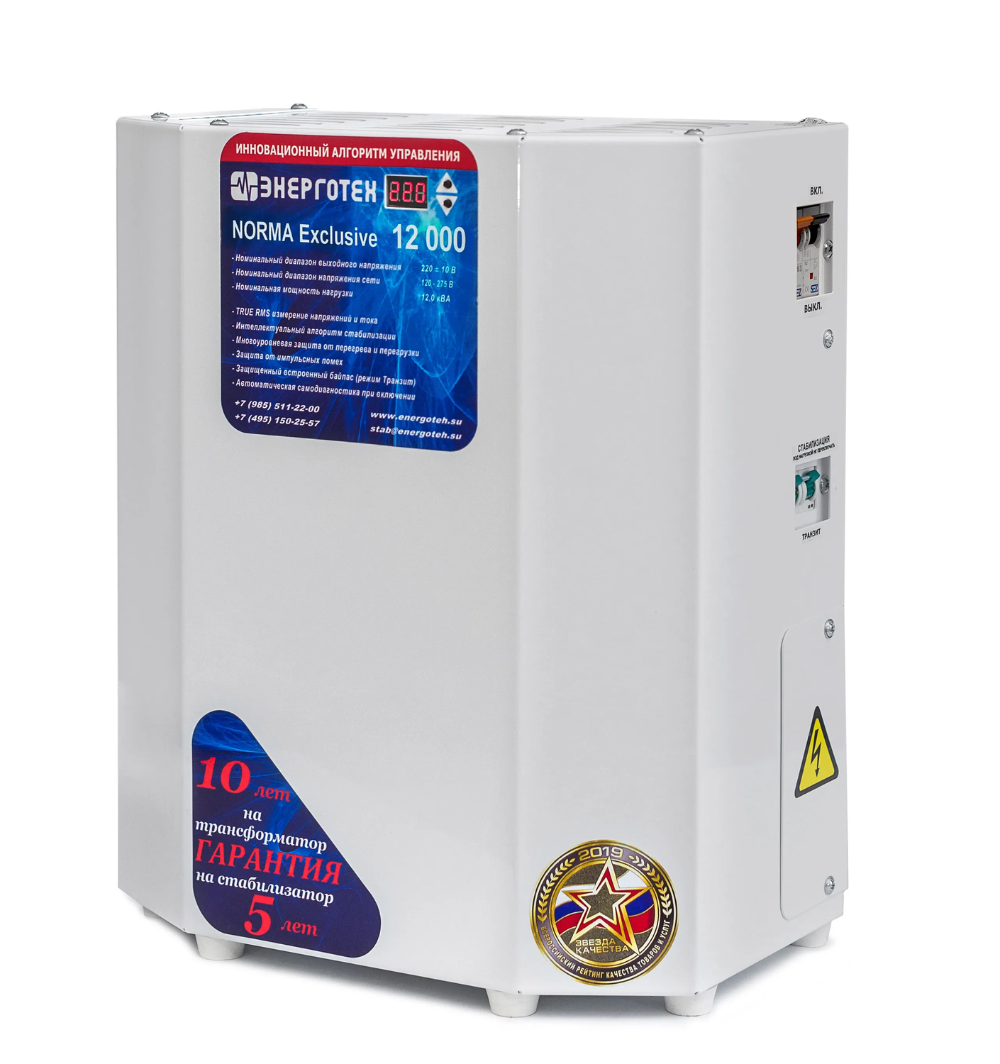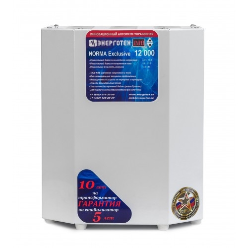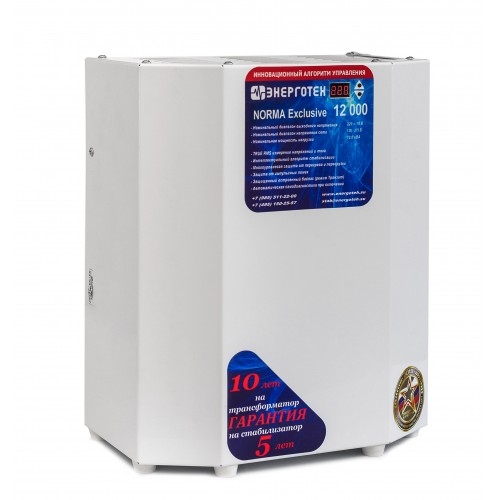 Приборы разработаны на базе 12-ступенчатых автотрансформаторов. Их рабочий диапазон напряжения (вх.) составляет 120275 В. Устройства обеспечивают автоматическую регулировку основных характеристик тока и оснащены информативными индикаторами. Стабилизаторы оборудованы независимой защитой от короткого замыкания, срабатывающей даже при аварийном режиме «Транзит». При нормальном функционировании для обработки поступающих данных и управления силовыми ключами используется плата. Номинальное напряжение сети, В: 220 Количество ступеней регулирования: 12 Рабочий диапазон входного напряжения, В: 120÷260 Рабочий диапазон выходного напряжения, В: 209÷231 Предельный диапазон входного напряжения, В: 60÷265 Точность стабилизации выходного напряжения , ±%: 220 В ±6% Режим работы: постоянный Номинальная мощность нагрузки, ВА: 12000 Максимальный входной ток, А: 58 Частота питающей сети, Гц: 50 Ток холостого хода, А: 0,7 Время реакции на изменение напряжения, мс: 20 Время реакции на аварийное изменение напряжения, мс: 20 Температура срабатывания тепловой защиты, °С: 105 Диапазон рабочей температуры, °С: от - 40 до +40 Масса, кг: 29 Габариты, мм: 210×420×345 Приборы с точностью стабилизации 4,8 % относятся к наиболее востребованной категории продукции. Они обеспечивают необходимые рабочие параметры при отсутствии завышенных требований. Такое оборудование рассчитано на круглосуточную эксплуатацию в широком температурном диапазоне с непрерывным измерением характеристик входного тока. Заявленный гарантийный срок завода-изготовителя составляет 60 месяцев. Стабилизаторы обеспечивают: автоматическое отключение от сети при повышении входного фазного напряжения свыше 285 В неискаженную форму синусоидального выходного напряжения; работу во всем диапазоне нагрузок от холостого хода до максимальной нагрузки; стабилизацию выходного фазного напряжения на уровне 220 В ±4,8% при изменении входного фазного напряжения от 120 до 275 В, частотой 50 Гц; отображение диапазона входного напряжения; индикацию в случае защитного отключения; защиту от короткого замыкания; защиту от превышения тока, с возможностью безопасной перегрузки на ограниченное время для пусковых токов электродвигателей; режим «транзит»; защиту потребителей от перенапряжения в режиме «транзит» при повышении входного фазного напряжения свыше 265 В. выключение стабилизатора при перегреве силового трансформатора; отключение силовых ключей при перегреве в случае перегрузки; защиту от некорректного подключения стабилизатора; Стабилизатор не имеет гальванической развязки между входом и выходом. Стабилизатор обеспечивает автоматическое отключение от сети при превышении верхнего значения входного напряжения предельного диапазон входных напряжений, при снижении напряжения до рабочего уровня происходит автоматическое включение стабилизатора. Стабилизатор обеспечивает защиту от короткого замыкания и длительной перегрузки на выходе, а также режим «транзит» в аварийной ситуации или в случае отсутствия необходимости в стабилизации напряжения. Основные преимущества: оперативное реагирование на перепады напряжения (20 мс); наилучшее соотношение цена/качество; непрерывный контроль сетевых характеристик; наглядная индикация текущих параметров; стабилизация входного напряжения в расширенном диапазоне 120275 В; наличие ава