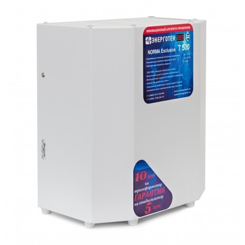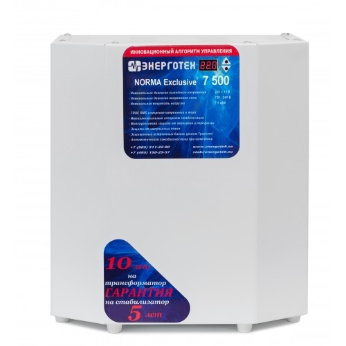 Приборы разработаны на базе 12-ступенчатых автотрансформаторов. Их рабочий диапазон напряжения (вх.) составляет 120275 В. Устройства обеспечивают автоматическую регулировку основных характеристик тока и оснащены информативными индикаторами. Стабилизаторы оборудованы независимой защитой от короткого замыкания, срабатывающей даже при аварийном режиме «Транзит». При нормальном функционировании для обработки поступающих данных и управления силовыми ключами используется плата. Номинальное напряжение сети, В: 220 Количество ступеней регулирования: 12 Рабочий диапазон входного напряжения, В: 120÷260 Рабочий диапазон выходного напряжения, В: 209÷231 Предельный диапазон входного напряжения, В: 60÷265 Точность стабилизации выходного напряжения , ±%: 220 В ±6% Режим работы: постоянный Номинальная мощность нагрузки, ВА: 7500 Максимальный входной ток, А: 37 Частота питающей сети, Гц: 50 Ток холостого хода, А: 0,45 Время реакции на изменение напряжения, мс: 20 Время реакции на аварийное изменение напряжения, мс: 20 Температура срабатывания тепловой защиты, °С: 105 Диапазон рабочей температуры, °С: от - 40 до +40 Масса, кг: 19 Габариты, мм: 210×345×390 Приборы с точностью стабилизации 4,8 % относятся к наиболее востребованной категории продукции. Они обеспечивают необходимые рабочие параметры при отсутствии завышенных требований. Такое оборудование рассчитано на круглосуточную эксплуатацию в широком температурном диапазоне с непрерывным измерением характеристик входного тока. Заявленный гарантийный срок завода-изготовителя составляет 60 месяцев. Стабилизаторы обеспечивают: автоматическое отключение от сети при повышении входного фазного напряжения свыше 285 В неискаженную форму синусоидального выходного напряжения; работу во всем диапазоне нагрузок от холостого хода до максимальной нагрузки; стабилизацию выходного фазного напряжения на уровне 220 В ±4,8% при изменении входного фазного напряжения от 120 до 275 В, частотой 50 Гц; отображение диапазона входного напряжения; индикацию в случае защитного отключения; защиту от короткого замыкания; защиту от превышения тока, с возможностью безопасной перегрузки на ограниченное время для пусковых токов электродвигателей; режим «транзит»; защиту потребителей от перенапряжения в режиме «транзит» при повышении входного фазного напряжения свыше 265 В. выключение стабилизатора при перегреве силового трансформатора; отключение силовых ключей при перегреве в случае перегрузки; защиту от некорректного подключения стабилизатора; Стабилизатор не имеет гальванической развязки между входом и выходом. Стабилизатор обеспечивает автоматическое отключение от сети при превышении верхнего значения входного напряжения предельного диапазон входных напряжений, при снижении напряжения до рабочего уровня происходит автоматическое включение стабилизатора. Стабилизатор обеспечивает защиту от короткого замыкания и длительной перегрузки на выходе, а также режим «транзит» в аварийной ситуации или в случае отсутствия необходимости в стабилизации напряжения. Основные преимущества: оперативное реагирование на перепады напряжения (20 мс); наилучшее соотношение цена/качество; непрерывный контроль сетевых характеристик; наглядная индикация текущих параметров; стабилизация входного напряжения в расширенном диапазоне 120275 В; наличие ава