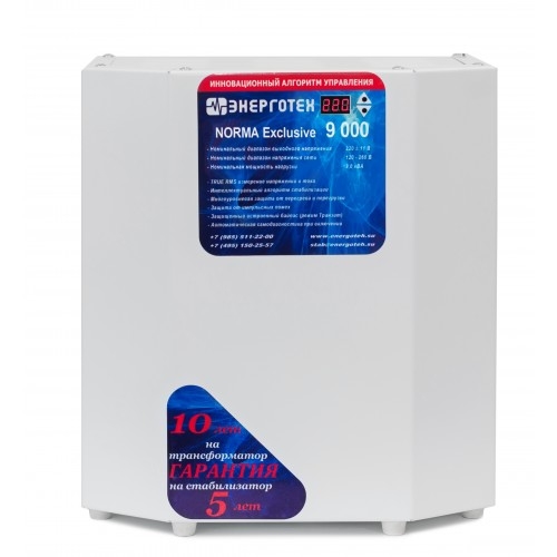 Приборы разработаны на базе 12-ступенчатых автотрансформаторов. Их рабочий диапазон напряжения (вх.) составляет 120275 В. Устройства обеспечивают автоматическую регулировку основных характеристик тока и оснащены информативными индикаторами. Стабилизаторы оборудованы независимой защитой от короткого замыкания, срабатывающей даже при аварийном режиме «Транзит». При нормальном функционировании для обработки поступающих данных и управления силовыми ключами используется плата. Номинальное напряжение сети, В: 220 Количество ступеней регулирования: 12 Рабочий диапазон входного напряжения, В: 120÷260 Рабочий диапазон выходного напряжения, В: 209÷231 Предельный диапазон входного напряжения, В: 60÷265 Точность стабилизации выходного напряжения , ±%: 220 В ±6% Режим работы: постоянный Номинальная мощность нагрузки, ВА: 9000 Максимальный входной ток, А: 44 Частота питающей сети, Гц: 50 Ток холостого хода, А: 0,5 Время реакции на изменение напряжения, мс: 20 Время реакции на аварийное изменение напряжения, мс: 20 Температура срабатывания тепловой защиты, °С: 105 Диапазон рабочей температуры, °С: от - 40 до +40 Масса, кг: 20 Габариты, мм: 210×345×390 Приборы с точностью стабилизации 4,8 % относятся к наиболее востребованной категории продукции. Они обеспечивают необходимые рабочие параметры при отсутствии завышенных требований. Такое оборудование рассчитано на круглосуточную эксплуатацию в широком температурном диапазоне с непрерывным измерением характеристик входного тока. Заявленный гарантийный срок завода-изготовителя составляет 60 месяцев. Стабилизаторы обеспечивают: автоматическое отключение от сети при повышении входного фазного напряжения свыше 285 В неискаженную форму синусоидального выходного напряжения; работу во всем диапазоне нагрузок от холостого хода до максимальной нагрузки; стабилизацию выходного фазного напряжения на уровне 220 В ±4,8% при изменении входного фазного напряжения от 120 до 275 В, частотой 50 Гц; отображение диапазона входного напряжения; индикацию в случае защитного отключения; защиту от короткого замыкания; защиту от превышения тока, с возможностью безопасной перегрузки на ограниченное время для пусковых токов электродвигателей; режим «транзит»; защиту потребителей от перенапряжения в режиме «транзит» при повышении входного фазного напряжения свыше 265 В. выключение стабилизатора при перегреве силового трансформатора; отключение силовых ключей при перегреве в случае перегрузки; защиту от некорректного подключения стабилизатора; Стабилизатор не имеет гальванической развязки между входом и выходом. Стабилизатор обеспечивает автоматическое отключение от сети при превышении верхнего значения входного напряжения предельного диапазон входных напряжений, при снижении напряжения до рабочего уровня происходит автоматическое включение стабилизатора. Стабилизатор обеспечивает защиту от короткого замыкания и длительной перегрузки на выходе, а также режим «транзит» в аварийной ситуации или в случае отсутствия необходимости в стабилизации напряжения. Основные преимущества: оперативное реагирование на перепады напряжения (20 мс); наилучшее соотношение цена/качество; непрерывный контроль сетевых характеристик; наглядная индикация текущих параметров; стабилизация входного напряжения в расширенном диапазоне 120275 В; наличие авар