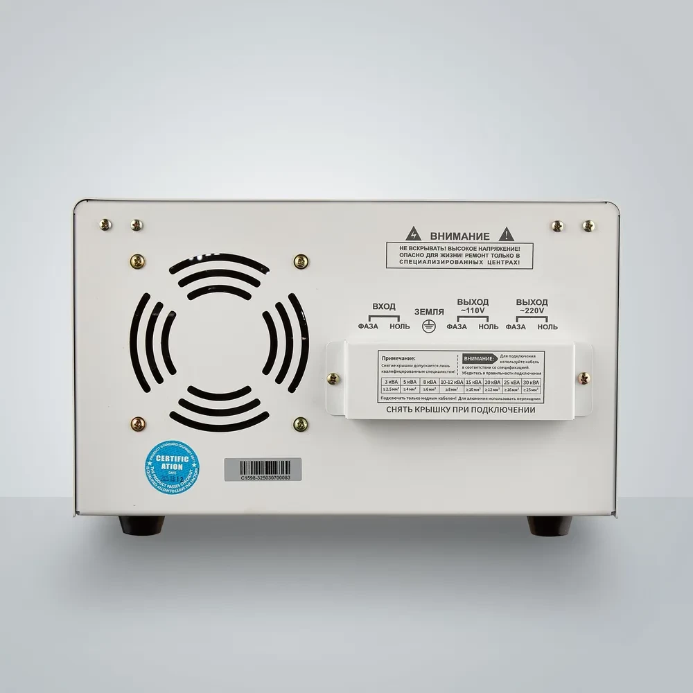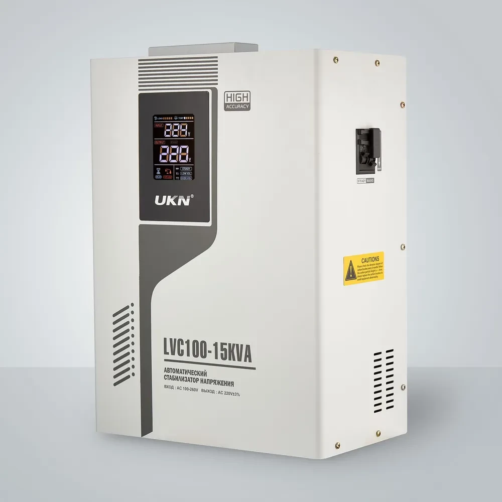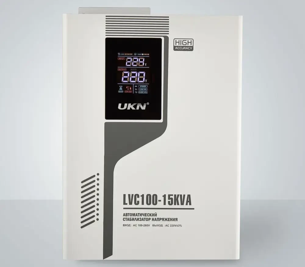 UKN LVC100-15 кВА навесной сервоприводный стабилизатор напряжения с рабочим диапазоном от 100 до 250 Вольт и мощностью в 15000 ВА. Достаточно для обеспечения стабильным напряжением не большого цеха или частного домовладения. Тип товара: Стабилизатор напряжения; Принцип работы: Электромеханический; Модельный ряд: LVC; Напряжение: Однофазный; Мощность: 15000 ВА; Рабочий диапазон: 100 - 260 Вольт; Точность: 220 Вольт ± 3 %; Температура эксплуатации: от 0 до +45 °C; Установка: Напольный; Родина бренда / страна производства: Россия / Китай Габариты: 480х350х210; Вес изделия: 30.00 кг; Основные достоинства электромеханических сервоприводных устройств в плавности изменения выходного сигнала и минимальным погрешностям выходного напряжения. Способен обеспечить надежное и стабильное питание приборов. Устройство может работать с входных напряжением от 100 до 260 Вольт, на выходе дает с минимальным разбросом 220 Вольт. Имеет встроенную защиту от перегрузок, повышенного и пониженного напряжения, коротких замыканий и перегрева трансформатора. Для отображения параметров входной и выходной цепи используется цифровое табло, которое также отображает внутреннее состояние прибора.