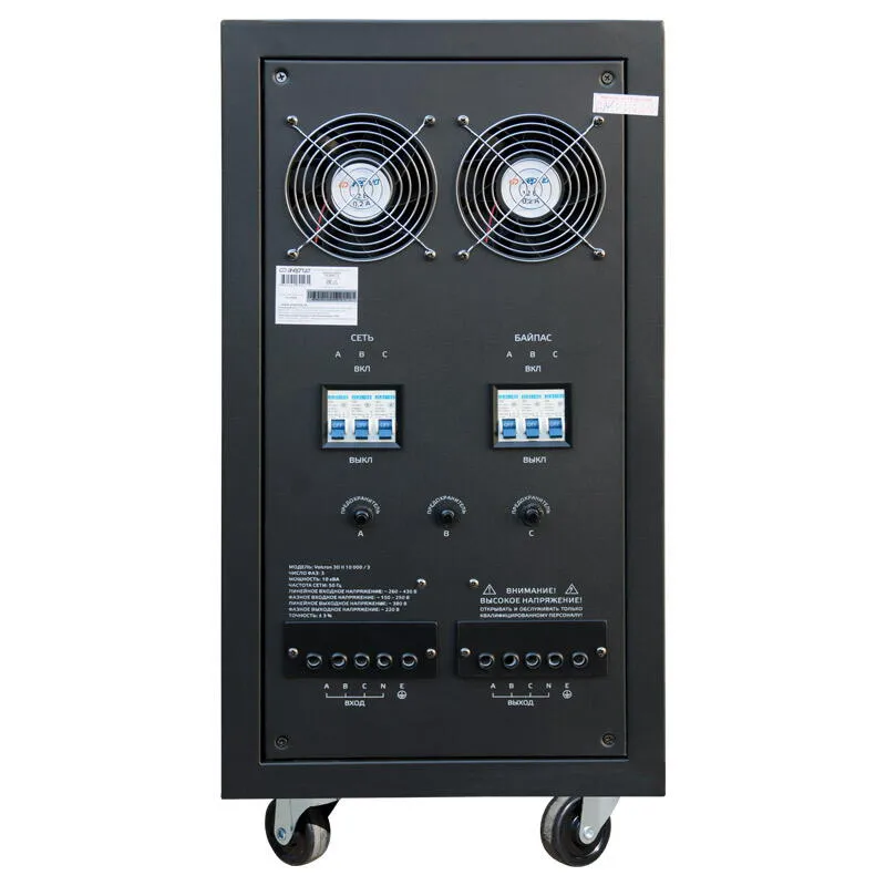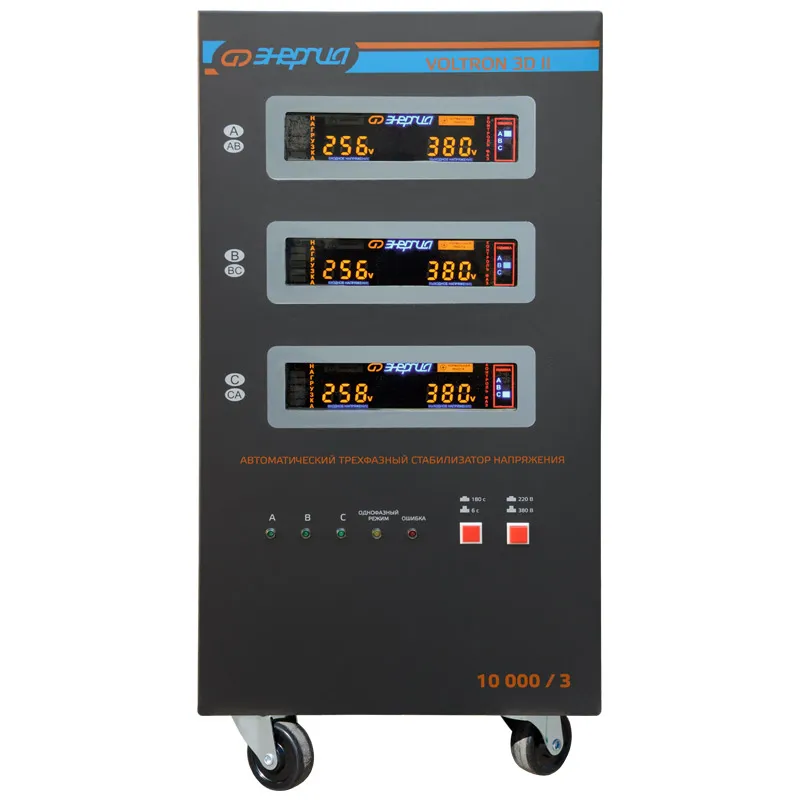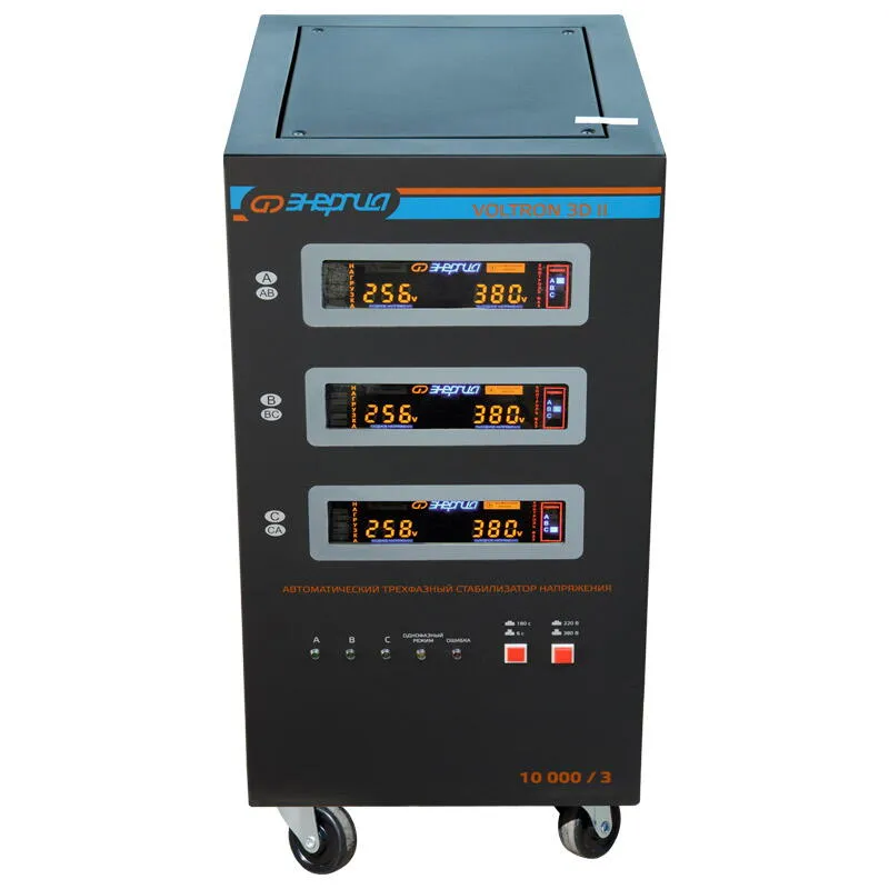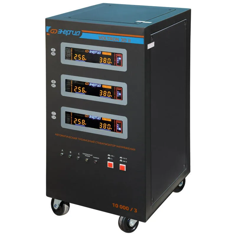 Трехфазный стабилизатор напряжения Энергия Voltron 3D II 10000/3 представляет собой высококачественное устройство, разработанное для обеспечения надежного и стабильного электропитания. Он идеально подходит для использования в условиях промышленных и коммерческих объектов, гарантируя безопасность и долговечность подключенной техники. Тип напряжения: Трехфазный Выходное напряжение, В: 220/380 Принцип стабилизации: Сервоприводный / Электро-механический Применение: Для промышленных нужд Режим работы: Непрерывный Способ установки: Напольный Индикация: Входное напряжение / Выходное напряжение / Защита / Задержка Подключение: Клеммная колодка Режим "БАЙПАС": Есть Задержка включения: 180 секунд / 6 секунд Отклонение выходных напряжений: ±3% Допустимая кратковременная перегрузка не более (%): 150 Защита от перегрева трансформатора, откл. при: 120 °С Защита от перегрузки по току: Автоматический выключатель Температура хранения, °С: -40...+50 Максимальная мощность (ВА): 10 000 Максимальная мощность (Вт): 8 000 КПД (%): 98 Степень защиты, IP: IP20 Рабочая температура, °С: 5 ... +40 Выходное напряжение (фазное) (В): 213 227 Выходное напряжение (линейное) (В): 368 391 Цвет корпуса: Чёрный Вес нетто (кг): 45 Габаритные размеры нетто (мм): 705х340х380 Вес брутто (кг): 55 Высокая мощность и эффективность: Он способен поддерживать максимальную полную мощность нагрузки до 10000 ВА (8000 Вт) в длительном режиме, что делает его идеальным решением для стабильной работы мощного оборудования. Надежность и точность: С электромеханическим принципом стабилизации и сервоприводным механизмом, этот стабилизатор гарантирует высокую точность поддержания выходного напряжения с отклонением всего в 3%, что защищает оборудование от возможных повреждений из-за колебаний напряжения. Безопасность использования: Устройство оснащено многочисленными функциями защиты, включая автоматическое отключение при перегрузке, коротком замыкании, перегреве и пропадании фаз. Это обеспечивает безопасную эксплуатацию и продлевает срок службы подключенного оборудования. Простота управления и индикация: Наличие LED дисплея для отображения входного и выходного напряжения, а также текущего состояния стабилизатора, делает его использование удобным и понятным для любого пользователя. Гарантия качества: Продукция сертифицирована и соответствует требованиям технических регламентов, что подтверждает ее высокое качество и надежность. Данное решение это оптимальное сочетание мощности, надежности и безопасности, способное удовлетворить потребности самых требовательных пользователей.