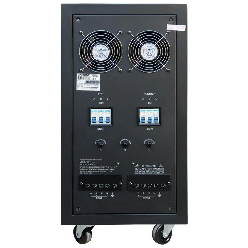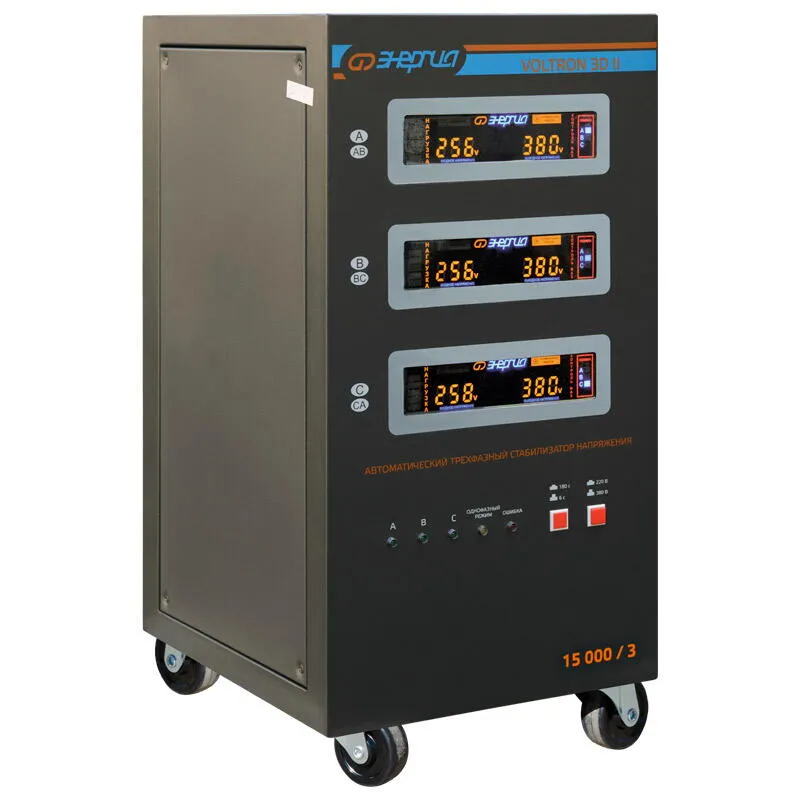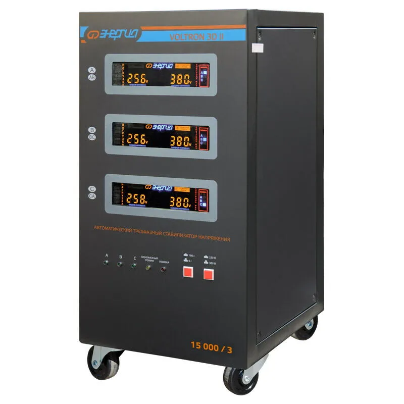 Энергия Voltron 3D II 15000/3 трехфазный электромеханический стабилизатор напряжения, разработанный для защиты электроприборов от скачков и перепадов напряжения в сети. Он идеально подходит для использования в частных домах, коттеджах, дачах, а также на небольших предприятиях. Тип напряжения: Трехфазный Выходное напряжение, В: 220/380 Принцип стабилизации: Сервоприводный / Электромеханический Применение: Для дачи / Для частного дома / Для промышленных нужд Режим работы: Непрерывный Способ установки: Напольный Индикация: Многофункциональный LED-дисплей Подключение: Клеммная колодка Режим "БАЙПАС": Есть Задержка включения: 180 секунд / 6 секунд Отклонение выходных напряжений: ±3% Допустимая кратковременная перегрузка не более (%): 150 Защита от перегрева трансформатора, откл. при: 120 °С Защита от перегрузки по току: Автоматический выключатель Максимальная мощность (ВА): 15 000 Максимальная мощность (Вт): 12 000 Частота выходного напряжения (Гц): 50 КПД (%): 98 Степень защиты, IP: IP20 Рабочая температура, °С: 5 ... +40 Выходное напряжение (фазное) (В): 213 227 Выходное напряжение (линейное) (В): 368 391 Цвет корпуса: Чёрный Вес нетто (кг): 50 Габаритные размеры нетто (мм): 705х340х380 Вес брутто (кг): 60 Основные преимущества: Широкий диапазон входного напряжения: 150 250В (фазного); 260 430В (линейного напряжения) Высокая точность стабилизации: ±3%. Мощность: 15 кВА. Быстрое время реакции: 20В/с. Допустимая длительная перегрузка (до 20 мин) - до 110%; Допустимая кратковременная перегрузка (до 2 мин) - до 150 %; Входная цепь - клеммная колодка; Выходная цепь - клеммная колодка; Способ охлаждения - автоматический вентилятор включается при 65°С; Защита от перекоса и пропадания фаз - реле контроля фаз; Напряжение отключения при повышении входного фазного/линейного напряжения - 275 / 476 В; Напряжение отключения при понижении входного фазного/линейного напряжения - 110 / 190 В; Встроенные средства защиты от косвенного прикосновения - заземлитель; Надежность: электромеханическая конструкция обеспечивает долгий срок службы. Безопасность: защита от короткого замыкания, перегрузки, перегрева. Информативность: цифровой дисплей отображает входное и выходное напряжение, ток нагрузки, мощность. Удобство эксплуатации: простое подключение и управление. Дополнительные функции: Режим байпаса: позволяет напрямую подключать нагрузку к сети, минуя стабилизатор. Защита от импульсных помех: обеспечивает безопасность чувствительного электронного оборудования.