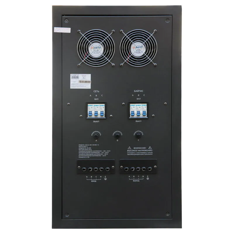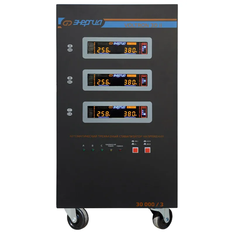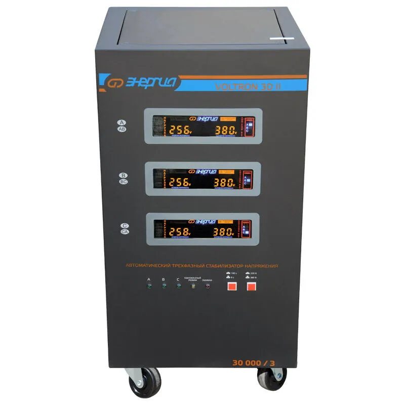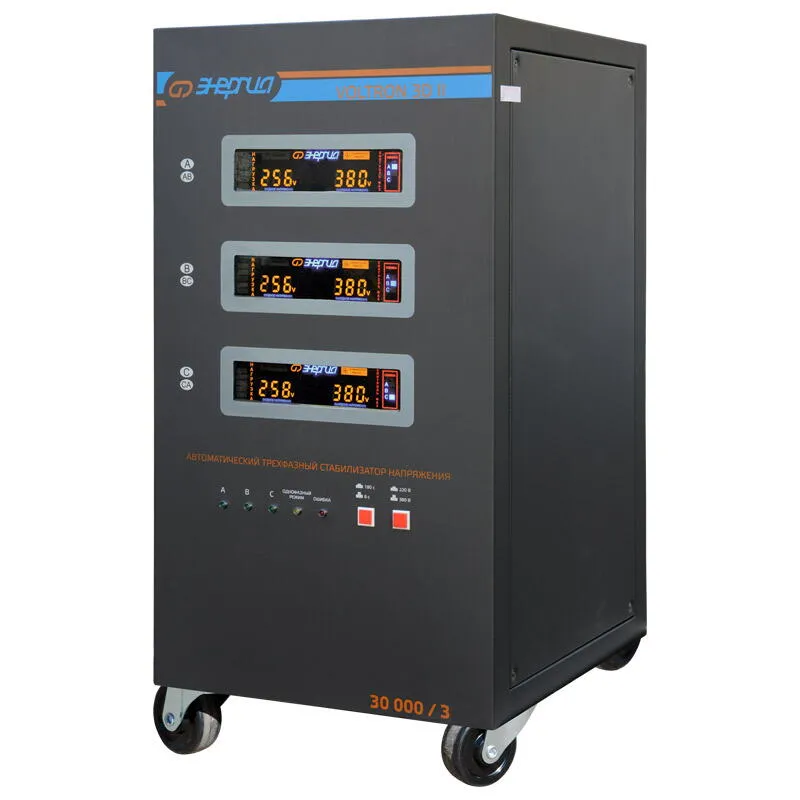 Стабилизатор напряжения Энергия Voltron 3D II 30000/3 представляет собой высокопроизводительное устройство, предназначенное для стабилизации и коррекции входящего электрического напряжения, обеспечивая надежное и стабильное питание для подключенного оборудования. Соответствует: всем российским и международным стандартам качества и безопасности; Оснащен интеллектуальной защитой от перегрузок, перегрева, короткого замыкания и других нештатных ситуаций. Тип напряжения: Трехфазный Выходное напряжение, В: 220/380 Принцип стабилизации: Сервоприводный / Электромеханический Применение: Для частного дома / Для промышленных нужд Режим работы: Непрерывный Способ установки: Напольный Индикация: LED-дисплей (многофункциональный) Подключение: Клеммная колодка Режим "БАЙПАС": Есть Задержка включения: 180 секунд / 6 секунд Отклонение выходных напряжений: ±3% Допустимая кратковременная перегрузка не более (%): 150 Защита от перегрева трансформатора, откл. при: 120 °С Защита от перегрузки по току: Автоматический выключатель Температура хранения, °С: -40...+45 Максимальная мощность (ВА): 30 000 КПД (%): 98 Степень защиты, IP: IP20 Рабочая температура, °С: 5 ... +40 Выходное напряжение (фазное) (В): 213 227 Выходное напряжение (линейное) (В): 368 391 Мощность (Вт): 24 000 Цвет корпуса: Чёрный Охлаждение: Воздушное конвекционное и принудительное Встроенные средства защиты: Короткое замыкание / Перегрев / Перегрузка Вес нетто (кг): 85 Габаритные размеры нетто (мм): 785х400х450 Вес брутто (кг): 97 Особенности Принцип стабилизации: электро-механический, сервоприводный. Диапазон входного напряжения: Фазного: 150 250 В; Линейного: 260 430 В. Допустимая перегрузка: Длительная (до 20 мин): до 110%; Кратковременная (до 2 мин): до 150%. Входная/выходная цепь: клеммная колодка. Скорость регулирования: не менее 20 вольт в секунду. Способ охлаждения: автоматический вентилятор включается при 65°С. Защита: От перекоса и пропадания фаз: реле контроля фаз; От повышенного/пониженного напряжения: отключение при 275/476 В / 110/190 В; От косвенного прикосновения: заземлитель. Тип заземления: Входная цепь: CE (LVO+EMC); Выходная цепь: CE (LVO+EMC).