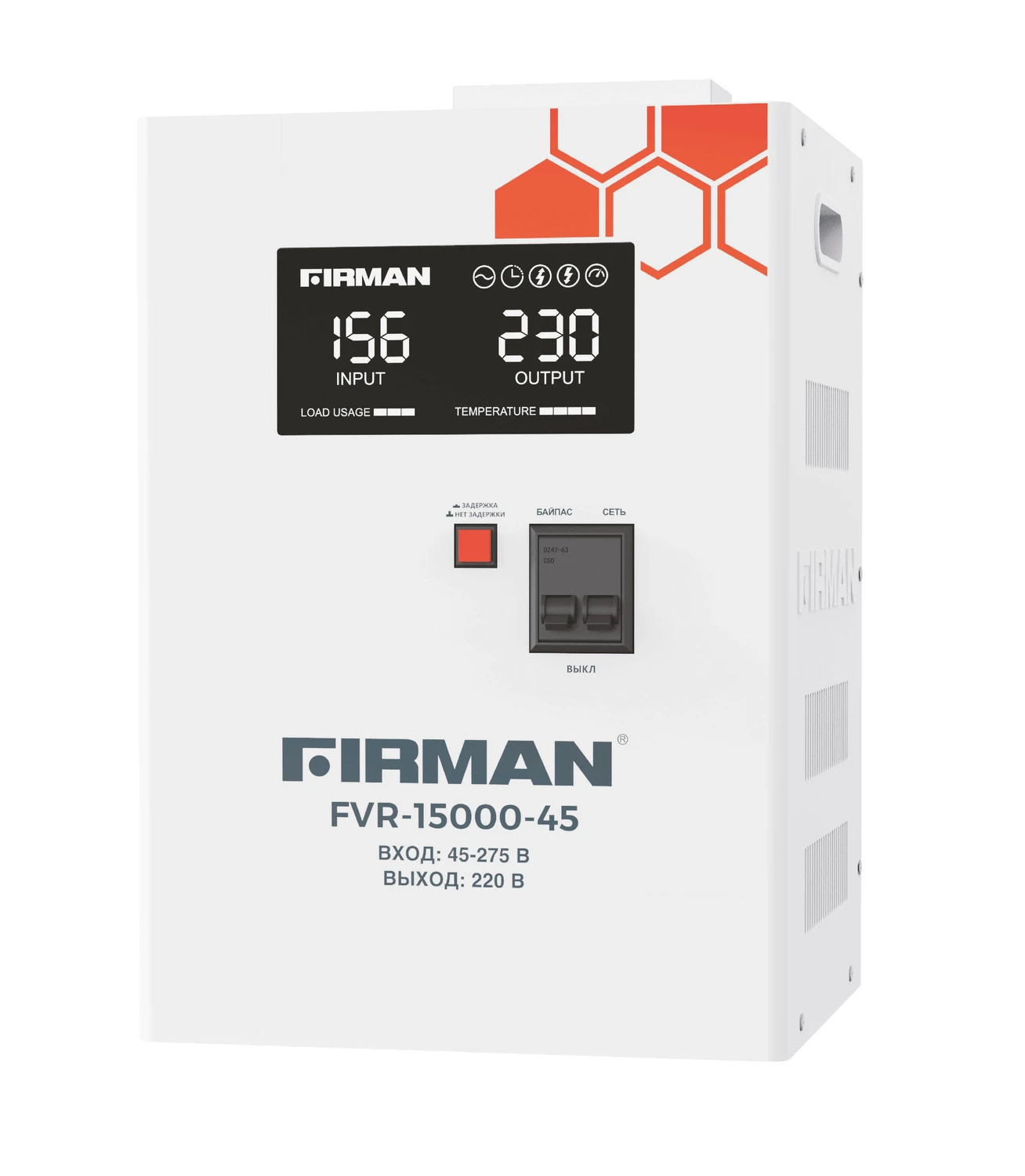 Однофазный стабилизатор напряжения FIRMAN FVR-15000-45 релейного типа – это надежное и высокоэффективное устройство, которое прошло строгий контроль качества на всех этапах производства и обеспечивает стабильное электропитание в вашем доме или офисе.: Напряжение: однофазный, Мощность: 12000 Вт / 15000 ВА, Диапазон работы: 45-275В Точность вых. напряжения: 220 +/- 10%, Принцип работы: сервоприводный, Установка: настенный, Цифровой дисплей: да, Подключение: клеммная колодка. Стабилизатор обладает всеми необходимыми функциями и системами защиты, которые гарантируют безопасную и комфортную эксплуатацию как для вас, так и для подключаемых потребителей широкого спектра электрических нагрузок.