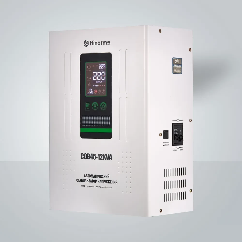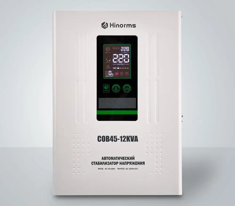 Стабилизаторы Hinorms оснащены самыми современными технологиями, такими как интеллектуальная система цифрового дисплея, которая обеспечивает спокойствие, защита от перегрузки для защиты кондиционера в нестабильные периоды и т. д. Более того, энергоэффективность стильных и инновационных стабилизаторов может достигать более 97%, что может удовлетворить все Ваши потребности. Тип напряжения: Однофазный Принцип стабилизации: Релейный Мощность: 12000 ВА Входное напряжение: 45 - 270 В Выходное напряжение: 220V ± 8% Частота: 50/60 Гц Трансформатор: тороидальный Тип дисплея: светодиодный цифровой дисплей (входное и выходное напряжение, избыточное и низкое напряжение, перегрузка, задержка, температура) КПД при полной нагрузке: 97% Задержка включения: короткий 3-5 сек, длинный 3-7 мин. Защита: от перенапряжения, перегрузки, высокой температуры, короткого замыкания Тип охлаждения: Воздушное (конвекционное и принудительное) Температура эксплуатации: -20...+55°С Относительная влажность: 90% Режим работы: Непрерывный Способ установки: Напольный, Настенный Цвет: Белый Отличаются высокой скоростью и широким диапазоном регулирования напряжения, особенно не заменимы при эксплуатации в проблемных сетях не имея аналогов среди конкурентов.