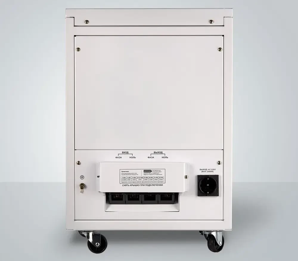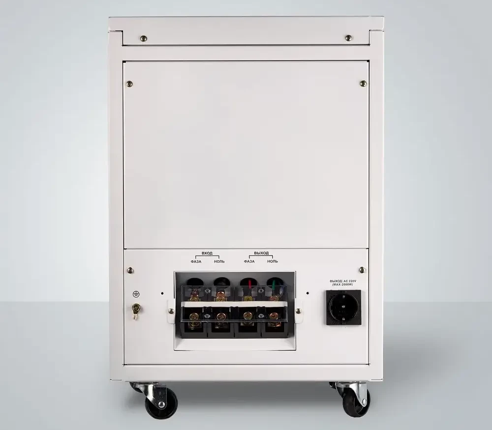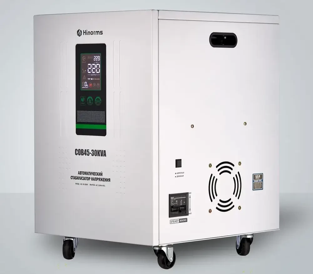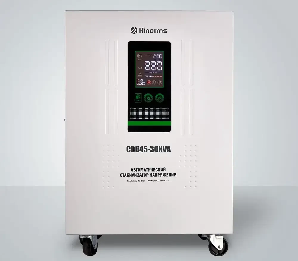 Стабилизатор напряжения Hinorms COB45-30kVA - это самый мощный стабилизатор напряжения в данной серии и предназначен для самых проблемных сетей, ведь данный аппарат сможет вытянуть сеть даже при просадках до 45 Вольт или, при необходимости, понизить с 270 включительно и падать на выход напряжение в пределах допустимой погрешности. Корпус покрыт белой порошковой краской и имеет информативный дисплей. Установка стабилизатора напольная, возможна настенная - на панель идущую в комплекте. Отличительная особенность данной серии - это высокая надежность, благородя использования комплектующие с большим запасом: качественный трансформатор, реле с запасом по току и т.д. Тип напряжения: Однофазный Принцип стабилизации: Релейный Мощность: 30000 ВА Входное напряжение: 45-270 В Выходное напряжение: 220V ± 8% Частота: 50/60 Гц Трансформатор: тороидальный Тип дисплея: светодиодный цифровой дисплей (входное и выходное напряжение, избыточное и низкое напряжение, перегрузка, задержка, температура) КПД при полной нагрузке: 97% Задержка включения: короткий 3-5 сек, длинный 3-7 мин. Защита: от перенапряжения, перегрузки, высокой температуры, короткого замыкания Тип охлаждения: Воздушное (конвекционное и принудительное) Температура эксплуатации: -20...+55°С Относительная влажность: 90% Режим работы: Непрерывный Способ установки: Напольный, Настенный Цвет: Белый