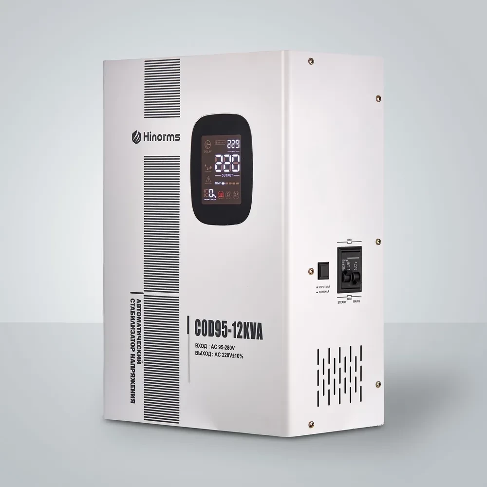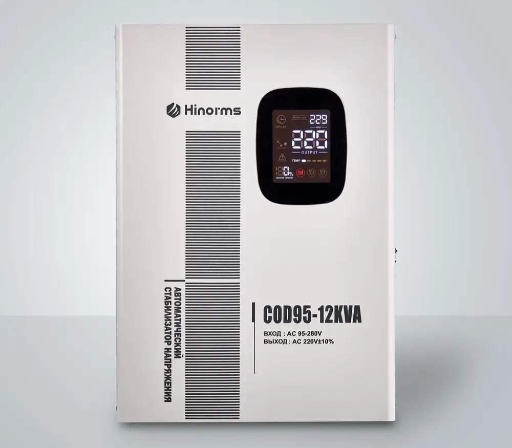 Стабилизаторы напряжения релейного типа Hinorms серии COD90 - это отличное решение для защиты бытового оборудования от некачественного напряжения в сети: широкий диапазон работы, информативный дисплей, симпатичный дизайн, настенно - напольное размещение и главное: низкая цена и высокое качество! Тип напряжения: Однофазный Принцип стабилизации: Релейный Мощность: 12000 ВА Входное напряжение: 90 - 270 В Выходное напряжение: 220V ± 10% Частота: 50/60 Гц Трансформатор: тороидальный КПД при полной нагрузке: 97% Задержка включения: короткий 3-5 сек, длинный 3-7 мин. Защита: от перенапряжения, перегрузки, высокой температуры, короткого замыкания Тип дисплея: светодиодный цифровой дисплей (входное и выходное напряжение, избыточное и низкое напряжение, перегрузка, задержка, температура) Тип охлаждения: Воздушное (конвекционное и принудительное) Температура эксплуатации: -20...+45°С Относительная влажность: 90% Режим работы: Непрерывный Способ установки: Напольный, Настенный Цвет: Белый Габаритные размеры : 465x238x332 Вес : 19 Отличаются высокой скоростью и широким диапазоном регулирования напряжения, особенно не заменимы при эксплуатации в проблемных сетях не имея аналогов среди конкурентов. Устройство оснащено самыми современными технологиями, такими как интеллектуальная система цифрового дисплея, которая обеспечивает спокойствие, защита от перегрузки для защиты кондиционера в нестабильные периоды и т. д. Более того, энергоэффективность стильных и инновационных стабилизаторов может достигать более 97%, что может удовлетворить все Ваши потребности.