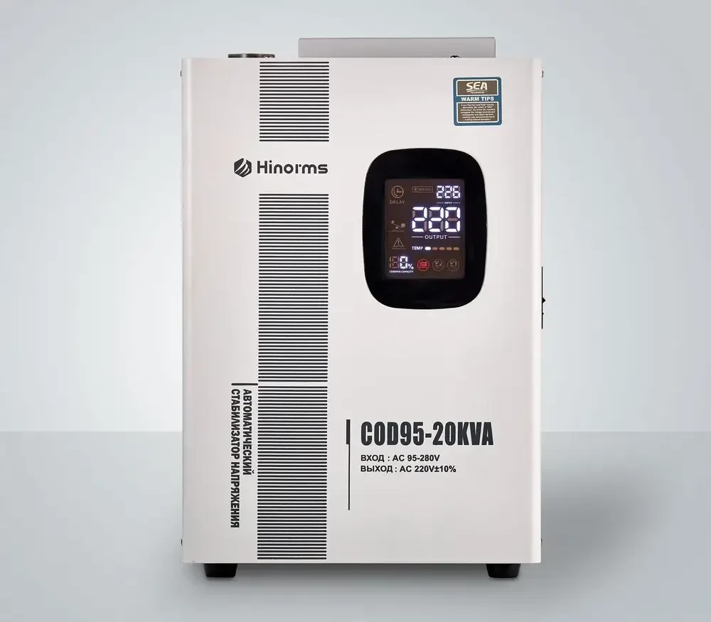 Стабилизаторы напряжения релейного типа Hinorms серии COD90 - это отличное решение для защиты бытового оборудования от некачественного напряжения в сети: широкий диапазон работы, информативный дисплей, симпатичный дизайн, настенно - напольное размещение и главное низкая цена и высокое качество! Тип напряжения: Однофазный Принцип стабилизации: Релейный Мощность: 20000 ВА Входное напряжение: 90 - 270 В Выходное напряжение: 220V ± 10% Частота: 50/60 Гц Трансформатор: тороидальный КПД при полной нагрузке: 97% Задержка включения: короткий 3-5 сек, длинный 3-7 мин. Защита: от перенапряжения, перегрузки, высокой температуры, короткого замыкания Тип дисплея: светодиодный цифровой дисплей (входное и выходное напряжение, избыточное и низкое напряжение, перегрузка, задержка, температура) Тип охлаждения: Воздушное (конвекционное и принудительное) Температура эксплуатации: -20...+45°С Относительная влажность: 90% Режим работы: Непрерывный Способ установки: Напольный, Настенный Цвет: Белый Вес : 26 Отличаются высокой скоростью и широким диапазоном регулирования напряжения, особенно не заменимы при эксплуатации в проблемных сетях не имея аналогов среди конкурентов. Устройство оснащено самыми современными технологиями, такими как интеллектуальная система цифрового дисплея, которая обеспечивает спокойствие, защита от перегрузки для защиты кондиционера в нестабильные периоды и т. д. Более того, энергоэффективность стильных и инновационных стабилизаторов может достигать более 97%, что может удовлетворить все Ваши потребности.