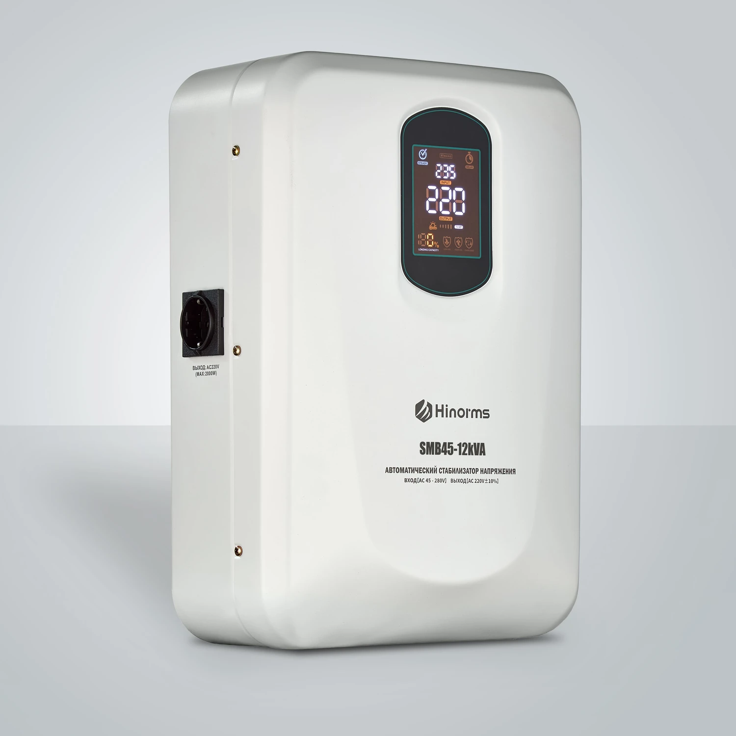 Стабилизаторы переменного напряжения Hinorms SMB45 - 12 кВА предназначен для работы в самых проблемных сетях в широчайшем диапазоне их разброса, от 45 до 280 Вольт! Выходное напряжение устройство поддерживает в диапазоне 220 Вольт с погрешностью до 10%, что приемлемо для большинства бытовых приборов и электроники. Стабилизатор Hinorms SMB45 - 12 кВА отличное решение для установки в частное домовладение, на даче или в мастерской с общей нагрузкой не более 12000 Вт. Мощность: 12000 ВА; Входное напряжение: 45 270 В; Выходное напряжение: 220 В ± 10%; Частота: 50/60 Гц; Время отклика: 10 мс; КПД при полной нагрузке: 97%; Тип охлаждения: воздушное (конвекционное и принудительное); Температура эксплуатации: от 20 до +55 °С; Относительная влажность: 90%; Режим работы: непрерывный; Способ установки: напольный, настенный; Цвет: белый. Вес без упаковки (кг) Габариты: 500х370х220; Вес изделия: 22.00 кг; Устройство обладает информативным дисплеем, отображающим текущую нагрузка в процентах, текущее входное и выходное напряжения а также возможные ошибки и аварии (перегрузка, задержка, температура). Металлический корпус покрыт белой порошковой краской и имеет эстетичный внешний вид. Установка возможна как напольном исполнении так и в навесном используя кронштейн, входящий в комплектацию Имеет несколько степеней защиты, в том числе защиту от повышенной нагрузки, защиту от повышенного и пониженного напряжения, защиту от короткого замыкания, а также термозащиту трансформатора Оснащен задержкой по включению задержка 6 и 200 секунд на выбор.