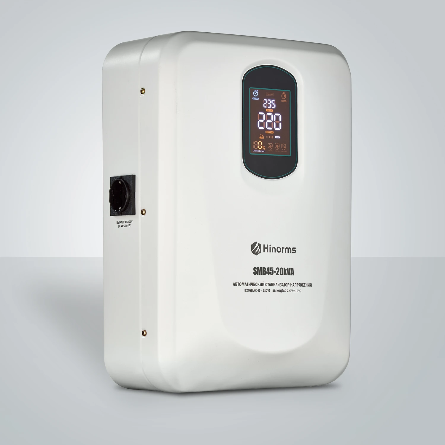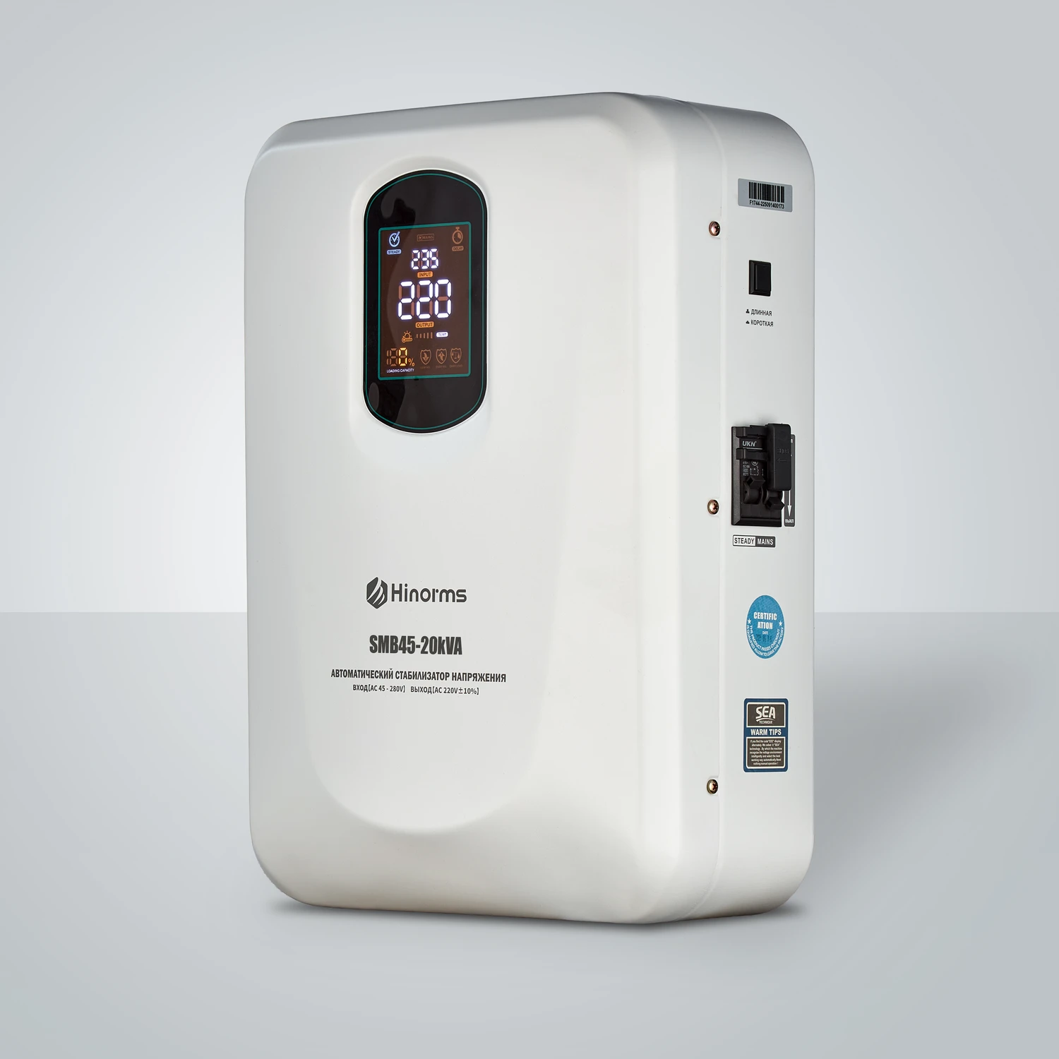 Стабилизаторы переменного напряжения Hinorms SMB45 - 20 кВА - это надежное устройство для поддержания сетевого напряжения в его в широчайшем диапазоне разброса, от 45 до 280 Вольт, в пределах нормы 220 Вольт, с погрешностью не более 10%. Устройство обладает информативным дисплеем, отображающим текущую нагрузка в процентах, текущее входное и выходное напряжения а также возможные ошибки и аварии (перегрузка, задержка, температура). Металлический корпус покрыт белой порошковой краской и имеет эстетичный внешний вид. Мощность: 20 000 ВА; Входное напряжение: 45 270 В; Выходное напряжение: 220 В ± 10%; Частота: 50/60 Гц; Время отклика: 10 мс; КПД при полной нагрузке: 97%; Тип охлаждения: воздушное (конвекционное и принудительное); Температура эксплуатации: от 20 до +55 °С; Относительная влажность: 90%; Режим работы: непрерывный; Способ установки: напольный, настенный; Цвет: белый. Вес без упаковки (кг) Габариты: 500х370х220; Вес изделия: 28.00 кг; Установка возможна как напольном исполнении так и в навесном используя кронштейн, входящий в комплектацию Имеет несколько степеней защиты, в том числе защиту от повышенной нагрузки, защиту от повышенного и пониженного напряжения, защиту от короткого замыкания, а также термозащиту трансформатора. Оснащен задержкой по включению задержка 6 и 200 секунд на выбор.