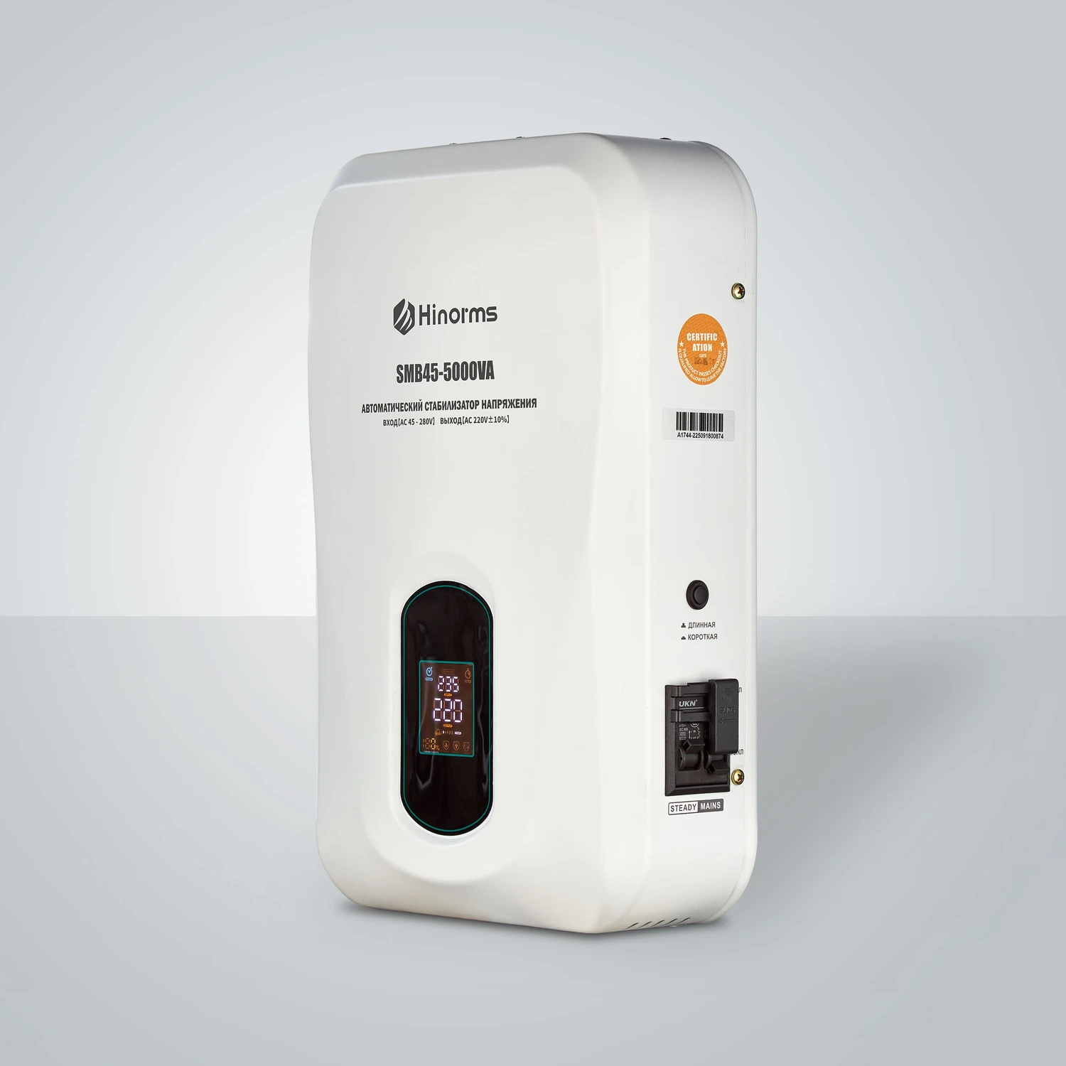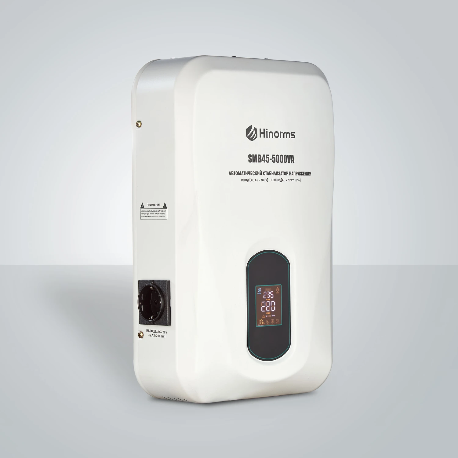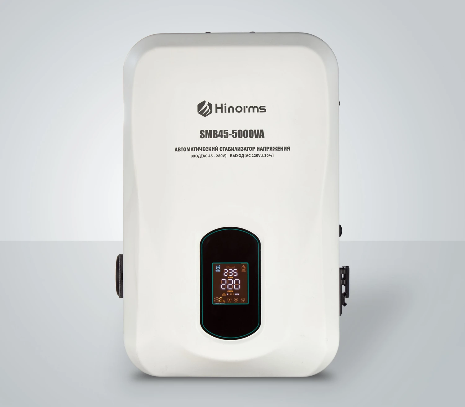 Стабилизаторы переменного напряжения Hinorms SMB45 - 5000 ВА, предназначен для защиты бытовых приборов в широком диапазоне входящей сети от 45 до 280 Вольт, выходное напряжение при этом поддерживает в пределах нормы нормы 220 Вольт, с погрешностью не более 10%. Отличное решение для установки на даче, в мастерской или на отдельный прибор, мощностью до 5000ВА. Устройство обладает информативным дисплеем, отображающим текущую нагрузка в процентах, текущее входное и выходное напряжения и возможные ошибки - аварии (перегрузка, задержка, температура). Металлический корпус покрыт белой порошковой краской и имеет эстетичный внешний вид. Мощность: 5000 ВА; Входное напряжение: 45 270 В; Выходное напряжение: 220 В ± 10%; Частота: 50/60 Гц; Время отклика: 10 мс; КПД при полной нагрузке: 97%; Тип охлаждения: воздушное (конвекционное и принудительное); Температура эксплуатации: от 20 до +55 °С; Относительная влажность: 90%; Режим работы: непрерывный; Способ установки: напольный, настенный; Цвет: белый. Вес без упаковки (кг) Габариты: 440х300х140; Вес изделия: 12.00 кг; Установка возможна как напольном исполнении так и в навесном используя кронштейн, входящий в комплектацию Имеет несколько степеней защиты, в том числе защиту от повышенной нагрузки, защиту от повышенного и пониженного напряжения, защиту от короткого замыкания, а также термозащиту трансформатора. Оснащен задержкой по включению задержка 6 и 200 секунд на выбор.