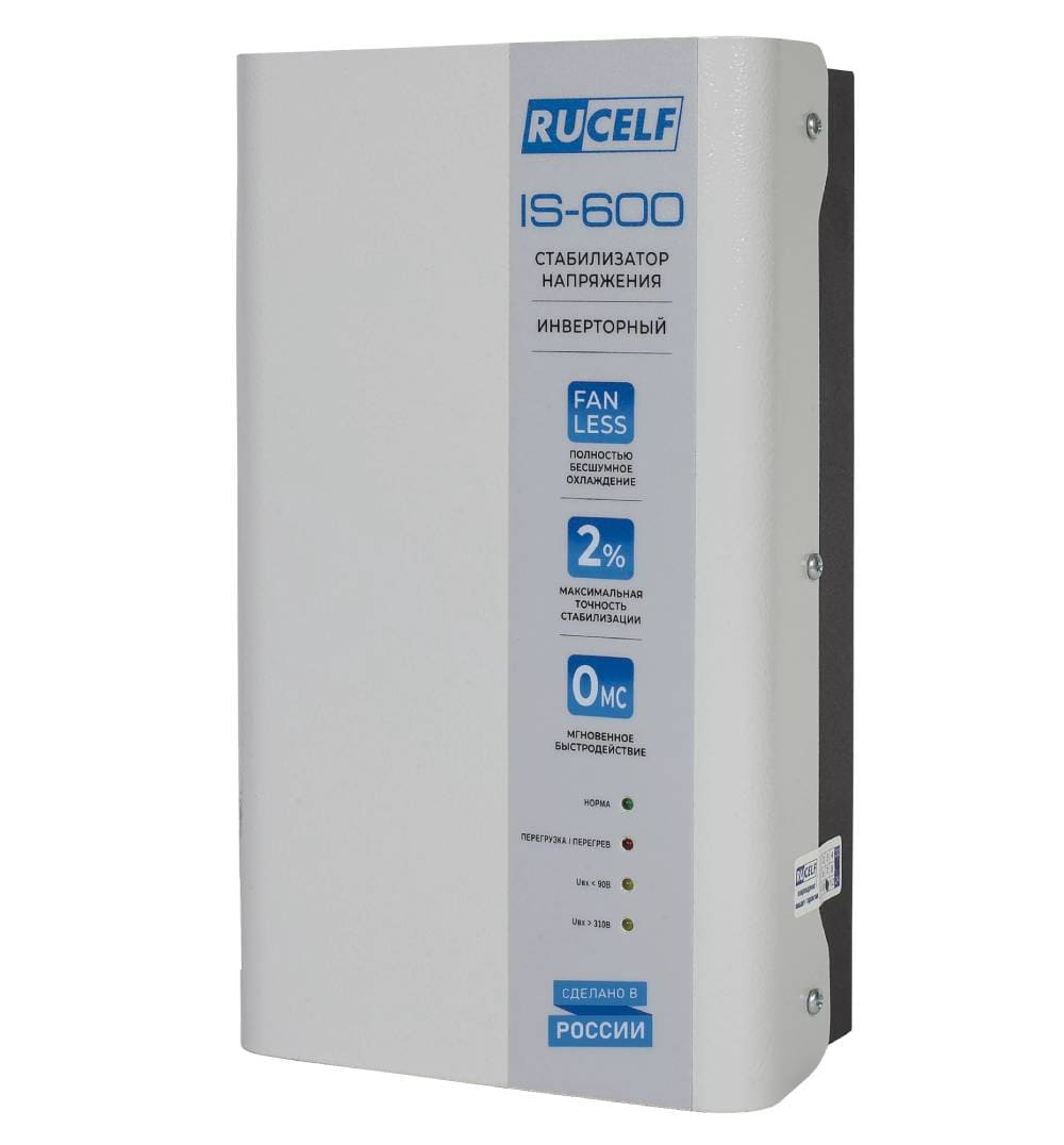 Инверторный стабилизатор напряжения RUCELF IS-600 обеспечивает высокую точность стабилизации и эффективную защиту бытовых электроприборов от колебаний напряжения в однофазных сетях. Технология двойного преобразования позволяет добиться лучших характеристик по сравнению с другими типами стабилизаторов, что является оптимальным выбором для потребителей, ценящих качество и надежность. Тип стабилизации: инверторный Полная мощность: 600 ВА Диапазон стабилизации: 110-290 В Рабочий диапазон: 90-310 В Точность стабилизации: ±2% Выходное напряжение: 230 В Скорость срабатывания: 0 мс Частота: 50 Гц Количество гнёзд: 1 Температура эксплуатации: от +5 до +40°С Степень защиты: IP20 Относительная влажность: <80% КПД: 97% Количество уровней защиты: 7 шт Материал корпуса: алюминий Габаритные размеры (ДхШхВ): 70х155х265 мм Масса нетто: 1,68 кг Многоуровневая система защиты: защита от повышенного входного/выходного напряжения защита от пониженного входного/выходного напряжения защита от короткого замыкания защита от перегрузки термозащита диагностическая система самозащиты защита от грозы и молний Сферы применения: системы отопления, насосное оборудование, бытовая техника, холодильное оборудование, умная защита дома, пк и оргтехника, тв
