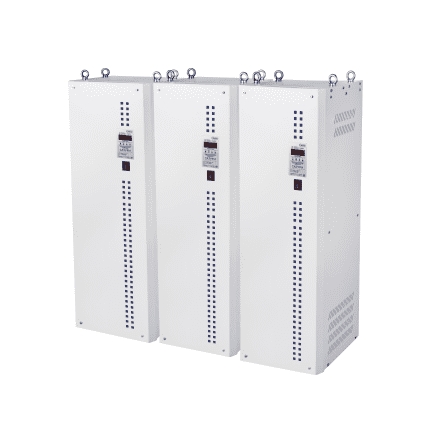 Предназначен для обеспечения качественного электропитания компьютеров, оргтехники, медицинского оборудования, аудио- видеотехники и другой промышленной и бытовой аппаратуры, в сетях с напряжением отличным от номинального; Для защиты электронной техники от индустриальных и атмосферных импульсных помех, распространяемых по сети питания (защите класса С по МЭК IEC 1312 1 (1995 02) и IEC 1643 1). Номинальная мощность, кВА (ток фазы, А): 90,0 (135) Активная мощность, кВт: 90,0 Диапазон входного напряжения при выходном 220±1%,В: 171-269 Диапазон входного напряжения при выходном 220±10%,В: 155-291 Диапазон входного напряжения при выходном 220-20%,В: 138 Масса, кг: 390 Габаритные размеры, мм: 1190х1035х390 (формируется из 3-х блоков 330х1035х390). Расстояние между блоками должно быть не менее 100 мм. Габариты указаны с учётом расстояния. Тип стабилизатора: Электромеханический Номинальная мощность, кВА: 90,0 Количество фаз: трехфазный Входное напряжение, В: 380 Температура эксплуатации, ˚С: от +40 до -25 Точность коррекции*, %: +/-1 Способ установки: напольный Допустимая перегрузка, %: 1000 КПД, %: 98 Байпас: есть Способ подключения: клеммные колодки Способ охлаждения: естественный Гарантия, мес: 24 Сопротивление изоляции, не менее, МОм: 2,0 Рекомендуемые товары: Array Характеристика срабатывания токовой защиты (тепловая): тип К Верхний порог напряжения отключения/включения нагрузки, В: 242/239 Нижний порог напряжения отключения/включения нагрузки, В: 176/198 Нижний порог напряжения включения нагрузки при работе в режиме "ПРЯМОЕ ВКЛЮЧЕНИЕ", не менее, В: 185 Защита от короткого замыкания: Iнагр>(4/5)Iмакс (тип В) Сечение проводов для подключения блока, мм2: 50,0 Коэффициент мощности, не менее: 1,0 Степень защиты: IP20 Номинальное входное напряжение, В, Гц: 220/380, 50 Максимальный ток, А: 135 СТАБИЛИЗАТОРЫ НАПРЯЖЕНИЯ ОБЕСПЕЧИВАЮТ: плавную регулировку напряжения в широком диапазоне с высокой точностью ± 1%, без разрыва фазы, без выброса помех в сеть и искажения формы питающего напряжения, что позволяет работать как с сильно-индуктивными (электродвигатели), так и с сильно-емкостными нагрузками (оборудование соляриев); в отличие от большинства стабилизаторов напряжения других фирм, обеспечивает корректную работу при питании от дизель-бензогенератора за счет высокой помехоустойчивости измерительных цепей; защиту электронного оборудования от импульсных перенапряжений; индикацию параметров сети; полную паспортную мощность во всем заявленном диапазоне напряжений. СИСТЕМЫ ЗАЩИТЫ НАГРУЗКИ: отключение нагрузки при аварии сети, при отклонении напряжения на выходе стабилизатора за безопасные для нагрузки пределы, с последующим автоматическим включением при восстановлении сети; защита нагрузки от импульсных перенапряжений, вызванных грозовыми разрядами, переходными процессами в сети, сварочным оборудованием и т.д. СИСТЕМЫ БЕЗОПАСНОСТИ ОБЕСПЕЧИВАЮТ: отключение стабилизатора напряжения при перегрузке и КЗ; контроль температуры внутри блока и отключение при перегреве; анализ параметров сети и тест системы при включении. ЦИФРОВАЯ ИНДИКАЦИЯ СЕТИ: индикация значения входного и выходного напряжения; ток нагрузки; мощность нагрузки; индикация по виду защитного отключения. СИСТЕМА BYPASS: прямое включение на случай аварии стабилизатора напряжения для обеспечения работы нагрузки. СКОРОСТЬ РЕГУЛИРОВКИ СТАБИЛИЗАТОРА НАПРЯЖЕНИЯ Зависит от вел