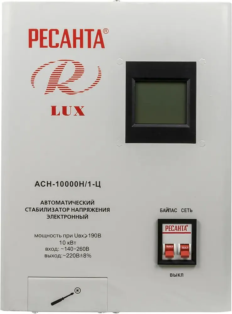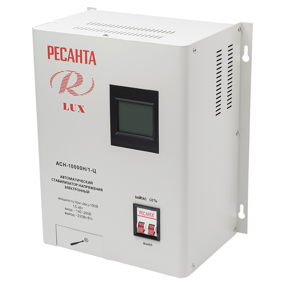 Стабилизатор напряжения серии LUX РЕСАНТА АСН-10000Н/1-Ц релейного типа предназначен для выравнивания входного напряжения и защиты приборов от перепадов напряжения с суммарной мощностью до 10 кВт. Работает с напряжением 220В с точностью до +/-8%. Устройство оснащено фильтрами сетевых помех, предотвращающими искажение частотной синусоиды, микропроцессорным управлением и цифровым индикатором напряжения, на котором отображаются параметры напряжения. Превышение пределов поддерживаемого входного напряжения автоматически отключает подачу питания. Прочный корпус защищает внутренние узлы аппарата от повреждений. Принцип работы: Релейный Тип напряжения: Однофазное (220 В) Максимальная мощность, Вт: 10000 Рабочая частота, Гц: 50 Максимальный ток, А: 52,6 Диапазон входного напряжения, В: 140-260 Высоковольтная защита, В: 245±5 Точность стабилизации, %: 8 Номинальная величина выходного напряжения, В: 220±8% Скорость стабилизации, В/с: 35 Время регулирования: Менее 15 мс КПД, %: 97 Дисплей: LCD Искажение синусоиды: Отсутствует Охлаждение: Принудительное Размещение: Настенное Рабочая температура, °C: 0 40 Влажность воздуха, %: 80 Класс защиты: IP20 Габариты упаковки: 0.36 × 0.295 × 0.45 м Вес, кг: 16.2 кг Защита: от короткого замыкания, от перегрева, от повышенного напряжения, от помех За счет своего принципа работы такой стабилизатор позволяет моментально реагировать даже на самые значительные и частые изменения напряжения в сети и предотвратить выход оборудования из строя. Номинальная мощность при входящем напряжении 190В составляет 10000Вт. Количество фаз = 1. Данный стабилизатор может обеспечивать стабильным питанием - телевизор, ресивер, DVD проигрыватель, кассовый аппарат, газовый котел. Особенность данного стабилизатора в возможности крепления его на стену. Преимущества: Встроенные фильтры входных и выходных частотных помех; Автоматическое отключение питания при превышении предельного значения напряжения; Широкий диапазон поддерживаемого входного напряжения; При кратковременных перегрузках прибор не выключается; Автоматическое включение при выравнивании напряжения в пределах рабочего диапазона; Микропроцессорное управление; Компактные габариты; Высокая скорость срабатывания защиты; LCD дисплей (жидкокристаллический); Индикаторы дисплея отображают все параметры защиты нагрузок стабилизатора, в том числе, входное/выходное напряжение, включение любой из защит, отображение величины напряжения стабилизатора. Также, на дисплее отображен обратный отсчет времени задержки; Время регулирования напряжения минимально и составляет менее 15 мсек. Т.е. менее 1 секунды; Мощный вентилятор для системы охлаждения; Системы защиты: Защита от выхода напряжения за пределы рабочего диапазона стабилизатора (рабочий диапазон стабилизатора от 140 до 260 В). Термозащита (тепловая защита) позволяет выключиться стабилизатору при превышении его мощности нагрузки над мощностью самого устройства.