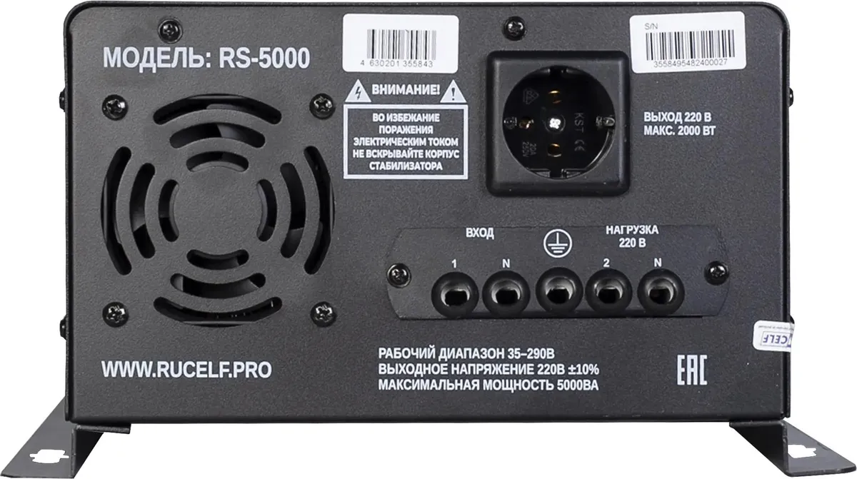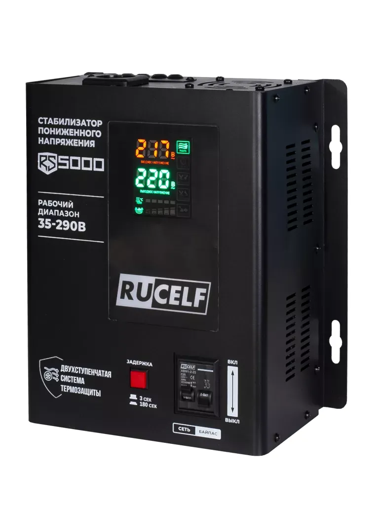 Стабилизаторы напряжения высокой точности RUCELF серии RS предназначены для поддержания стабильного напряжения в однофазных сетях для питания электро приборов бытового назначения 220 В, 50 Гц. Преимущества: работа от 35 в; двухступенчатая термозащита; система smart control; автоматический байпас; клеммное подключение; многоуровневая система защиты. Тип стабилизации: Релейный Число фаз: 1 Мощность, ВА: 5000 Выходное напряжение, В: 220 Подключение к сети: Клеммы Способ установки: Напольный Тип входного напряжения: однофазное Выходное напряжение: 220 В Погрешность: 10 % Мин. входное рабочее напряжение: 35 В Макс. входное напряжение (рабочее): 290 В Выходные розетки (со стабилизацией): 1 шт. Коэффициент полезного действия: 90 % Защита: от повышенного напряжения Функции: байпас Форма выходного сигнала: синусоида без искажений Отображение информации: ЖК-дисплей Вольтметр: входное и выходное напряжения Класс защиты: IP20 Тип охлаждения: принудительное Мин. рабочая температура: 0 °C Макс. рабочая температура: 40 °C Цвет товара: черный Ширина (нетто), м: 0.33 Высота (нетто), м: 0.17 Глубина (нетто), м: 0.3 Вес (нетто), кг: 12.4 Комплектация: Стабилизатор напряжения - 1 шт. Паспорт - 1 шт. Гарантийный талон - 1 шт. Упаковка - 1 шт. Крепления для навесного монтажа - 1 к-т