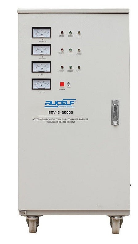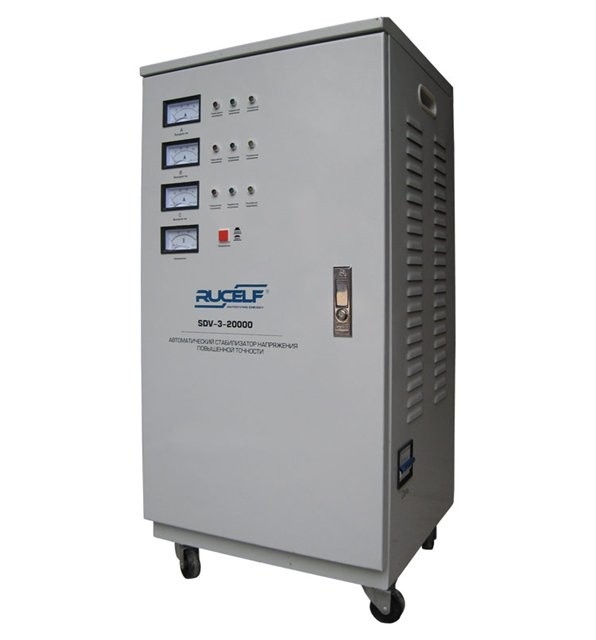 Серия трехфазных стабилизаторов Rucelf SVC разработана для защиты электронных устройств от аварийных скачков электроэнергии начиная от городской квартиры и до крупных жилых и производственных комплексов, в полном соответствии с международными стандартами. Тип стабилизатора: электромеханический с сервоприводом Мощность: 20000 ВА Индикатор напряжения: светодиодный, аналоговый Напряжение входа, В: 280-430 Напряжение выхода, В: 380+3% КПД, %: 97 Система охлаждения: естественная, воздушная Тип подключения: клеммная колодка Режим работы: непрерывный Защита: тепловая, короткое замыкание, повышенное и пониженное напряжение Относительная влажность, %: 80 Рабочий диапазон температуры окружающей среды, °С: 0 - +40С° Размеры (ВхШхГ), мм: 630x600x960 Масса, кг: 100 Преимущества: Микропроцессорное управление. Плавная регулировка напряжения в широком диапазоне. Высокая точность выходного напряжения. Высокий КПД. Защита от скачков напряжения. Без искажения формы синусоиды. Цифровой контроль температуры. Аналоговая плата дополнена микропроцессором. Нет вентилятора, низкий уровень шума. Качественные концевые выключатели. Медная пластина в реле коммутации. Низкий уровень шума издаваемый стабилизатором напряжения при работе
