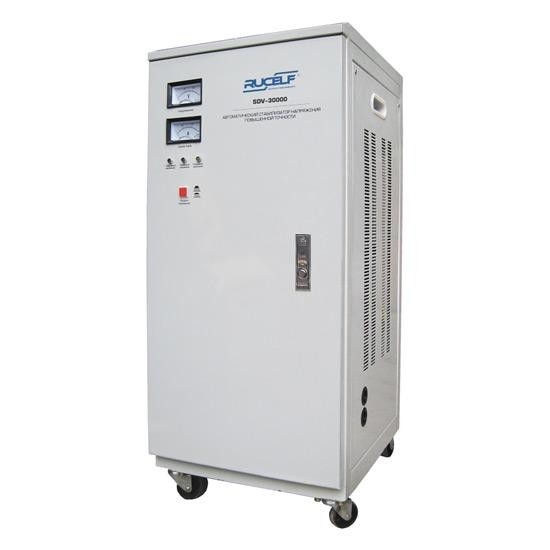 Стабилизатор напряжения RUCELF SDV-30000 очень мощный прибор, специально разработанный для безопасной работы крупного оборудования на небольших предприятиях и стабилизации напряжения в загородных домах или коттеджах. Имеет усиленную защиту от скачков напряжения, корректно работает с высокими токами нагрузки. Обеспечивает высокую точность выходного напряжения и высокий КПД. Тип стабилизатора - электромеханический Активная мощность - 24 кВт Полная мощность - 30 кВ·А Тип входного напряжения - однофазное (220 В) Входное рабочее напряжение - 150-260 В Входное предельное напряжение - 130-275 В Точность стабилизации - 1.5% Выходное напряжение - 217-223 В КПД - 98% Входная частота - 50-50 Гц Форма выходного сигнала - синусоида без искажений Защита - от короткого замыкания, от перегрева, от повышенного напряжения Размещение - напольное Тип охлаждения - естественное Отображение информации - стрелочные индикаторы (вольтметр отображает входное и выходное напряжения) Задержка запуска - есть Клеммы - есть Класс защиты - IP20 Влажность окружающей среды - 80% (макс.) Рабочая температура - 0 °C 40 °C Габариты, ШхВхГ - 380х840х415 мм Масса - 95 кг