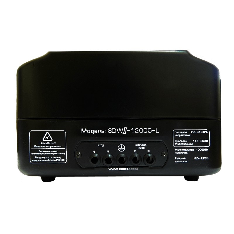RUCELF SDW II-12000-L является логическим продолжением популрной модели RUCELF SDW-10000-D, ставшей самой продаваемой среди стабилизаторов с плавной регулировкой напряжения, мощностью 10 киловатт. Новую модель отличает увеличенное количество степеней защиты, новый информативный жидкокристаллический дисплей, система индикации ошибок, большее количество термодатчиков, современный дизайн, все это - новый RUCELF SDW-II-12000-L. Модель: RUCELF SDW II-12000-L Мощность выходная максимальная: 10 кВт Мощность при напряжении 180 В: 8,3 кВт Мощность при напряжении 160 В: 6,7 кВт Мощность при напряжении 140 В: 5,0 кВт Тип стабилизатора: однофазный Тип стабилизации: электромеханический Способ установки: настенный Номинальное входное напряжение: 145-260 В Предельное входное напряжение: 120-275 В Выходное напряжение: 220 В Погрешность стабилизации: 3,5% Частота питающей сети: 50 Гц Режим работы непрерывный Искажение синусоиды: отсутствует Способ охлаждения: естественный Предельный ток нагрузки: 45 А Защита от токовой перегрузки: автоматический выключатель Максимальная температура нагрева обмотки автотрансформатора: 95°С Скорость стабилизации 15 В/сек. Наличие байпаса: есть Способ подключения: клеммная колодка Рабочая температура: -0°С+40°С Класс защиты: IP20 КПД: 97% Габаритные размеры коробки: 520х380х250 мм. Габаритные размеры стабилизатора: 440х300х165 мм. Вес брутто: 27.8 кг. Вес нетто: 27 кг. Как работает стабилизатор? Внутри корпуса электромеханического стабилизатора расположен тороидальный трансформатор, внутри которого находится реверсивный электродвигатель, работающий от напряжения 12 вольт, которые нам выдает встроенный понижающий трансформатор. На трансформаторе закреплены 2 щеточных узла, в которых расположены щетки и сделаны радиаторы охлаждения, которые не дают нашему щеточному узлу перегреваться. Микропроцессорная плата управления дает команду и сервопривод перемещает щёточный узел по специально подготовленному для этого месту, на то количество витков, которое необходимо для обеспечения на выходе напряжения 220 вольт. Так работает сервопривод, отрабатывая скачки входного напряжения.