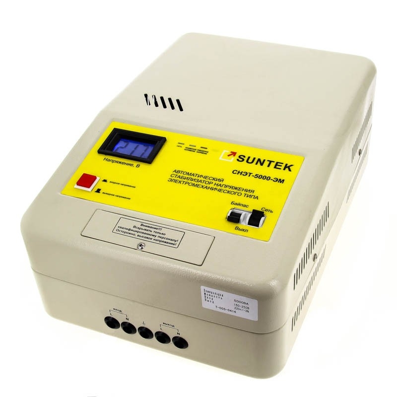 Однофазный стабилизатор напряжения электромеханического типа SUNTEK 5000ВА под крышкой имеет следующие узлы и комплектующие: Плата управления; Сервопривод; Катушка автотрансформатора на 5000ВА, намотка выполнена плотно соответствующим медным кабелем. Рабочая поверхность катушки (соприкосновения витков со щеткой) идеально ровная после сверх точной обработки, искрения минимизированы. Щетка перекрывает два витка, исключая разрыв цепи на выходе стабилизатора. Реле контроля напряжения, байпас, автомат, питающий двигатель трансформатор, индикация. Номинальная мощность, ВА: 5000 Максимальный ток, А: 25 Рабочий диапазон входных напряжений, В: 120 - 285 Ном. диапазон выходного напряжения, В: 215 - 225 Тип стабилизации: электромеханический (сервопривод) Погрешность выходного напряжения,%: 3 Регулировка: плавная, автоматическая Искажение синусоиды: отсутствует Вариант подключения: клеммная колодка Рабочий диапазон t°С: -5 - +40 Охлаждение: пассивное Способ подключения в сеть: клеммная колодка Потребляемый ток, А: - Корпус: металл Защита от к/з: + Грозозащита: - Минимальная розничная цена, руб.: 13550 Габаритные размеры д-ш-в, см: 37х26х17 Вес, кг.: 15