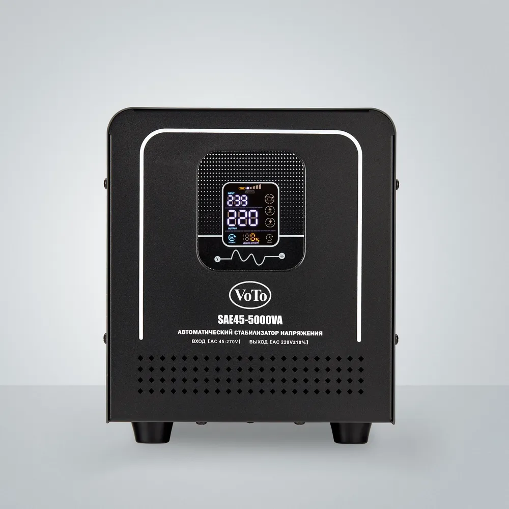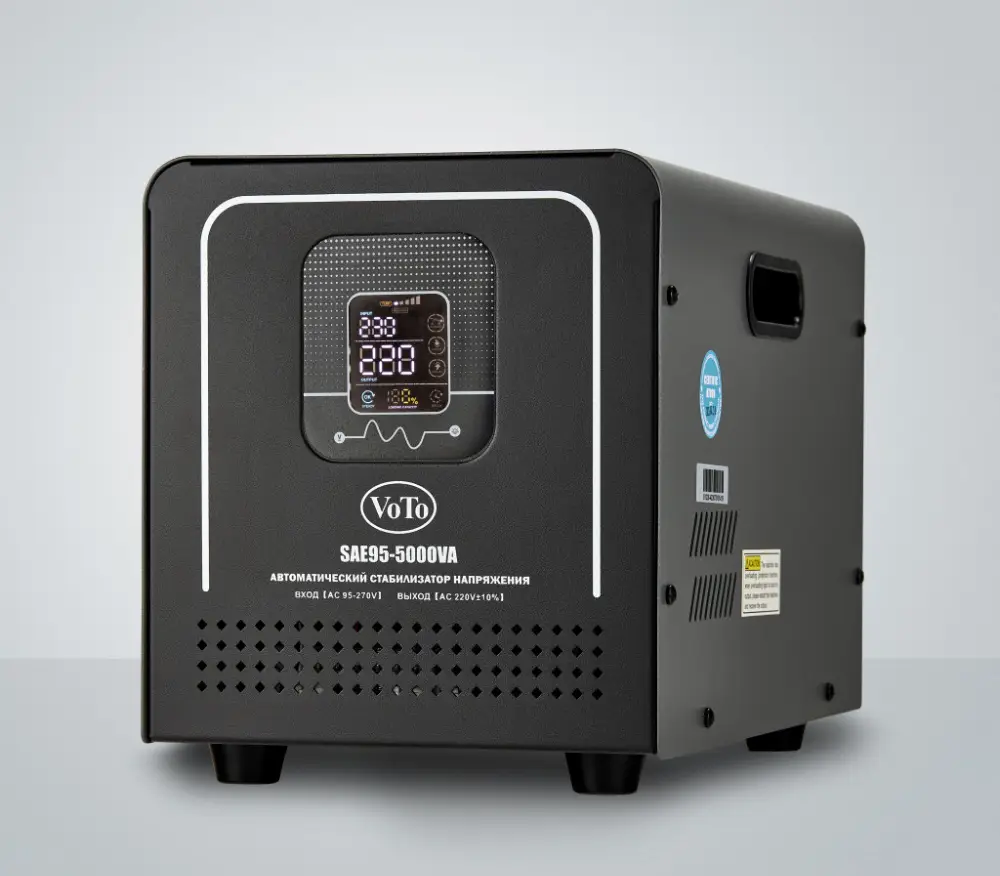 Данная модель хорошо подойдет, если нужно обеспечить безопасность одного-двух не очень мощных потребителей электроэнергии. При этом диапазон значений входного напряжения варьируется от 95 до 270 Вольт. Принцип работы: Релейный Мощность: 5000 ВА Рабочий диапазон: 90-270 Выходное напряжение: 220±10 % Вес одн.ед.товара: 12 кг Тип размещения: Напольный Количество фаз: Однофазный рабочая частота: 50-60 Гц Влажность окружающей среды: Не более 80 % Время срабатывания: 20 мс Защита от повышенной нагрузки: Присутствует Защита от повышенного напряжения: Присутствует Защита от пониженного напряжения: Присутствует Защита от короткого замыкания: Присутствует Термозащита трансформатора: Присутствует Габаритные размеры: 41х26х28,5 см Количество в упаковке: 1 шт Многим хорошо известно, что электросети за городом обычно дают напряжение намного меньше номинала, и это постоянная тенденция, справиться с которой можно установкой такого стабилизатора. На выходе SAE95-5000VA дает 220 Вольт с разбросом всего в 10%, что приемлемо для подавляющего количества потребителей. Короткая задержка 3-5 секунд, длинная задержка 5-7 минут. Хороший эргономичный и строгий дизайн устройства, напольно-настенное размещение делают его использование удобным и функциональным. Для монтажа не требуется особых знаний электротехники, достаточно внимательно изучить паспорт и следовать инструкциям. Прибор работает в однофазных сетях, защищен от повышенной нагрузки, пониженного и повышенного напряжения. Также есть защита от короткого замыкания и термозащита трансформатора, т.к. это самый нагреваемый элемент в устройстве. Для удобства пользования аппаратура оснащена цифровой индикацией входных/выходных параметров и режима работы. Прибор хорошо сглаживает форму входного сигнала, убирает помехи, хорошо справляется с исправлением постоянно сниженного или завышенного входного напряжения. Шумовой фон от работы устройства находится в пределах санитарных норм, специфический гул практически не слышен и не создает дискомфорта даже при установке аппаратуры непосредственно в жилой комнате. В общем, такая модель неплохой выбор при необходимости защиты отдельного потребителя или группы с небольшой суммарной мощностью. Не использовать с медицинским оборудованием жизнеобеспечения пациентов и любыми устройствами, мощность которых превышает значение "Максимальная мощность на выходе", указанное в таблице Технические характеристики.