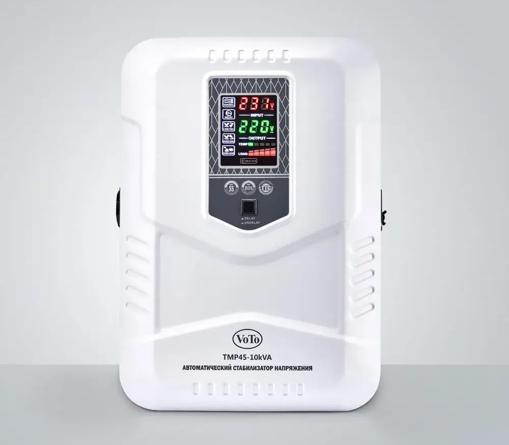 Автоматические стабилизаторы напряжения серии TMP представляют собой модели как для настольного, так и для настенного монтажа с лаконичным дизайном и информативным цифровым дисплеем. Тип напряжения: Однофазный Принцип стабилизации: Релейный Мощность: 10000 ВА Входное напряжение: 45 - 270 В Выходное напряжение: 220V ± 10% Частота: 50/60 Гц Трансформатор: тороидальный Тип дисплея: светодиодный цифровой дисплей (входное и выходное напряжение, избыточное и низкое напряжение, перегрузка, задержка, температура) КПД при полной нагрузке: 97% Задержка включения: короткий 3-5 сек, длинный 3-7 мин. Защита: от перенапряжения, перегрузки, высокой температуры, короткого замыкания Тип охлаждения: Воздушное (конвекционное и принудительное) Температура эксплуатации: -20...+55°С Относительная влажность: 90% Режим работы: Непрерывный Способ установки: Напольный, Настенный Цвет: Белый Отличаются высокой скоростью и широким диапазоном регулирования напряжения. Широко используются в различных отраслях промышленности и частного использования для защиты офисной и бытовой техники.