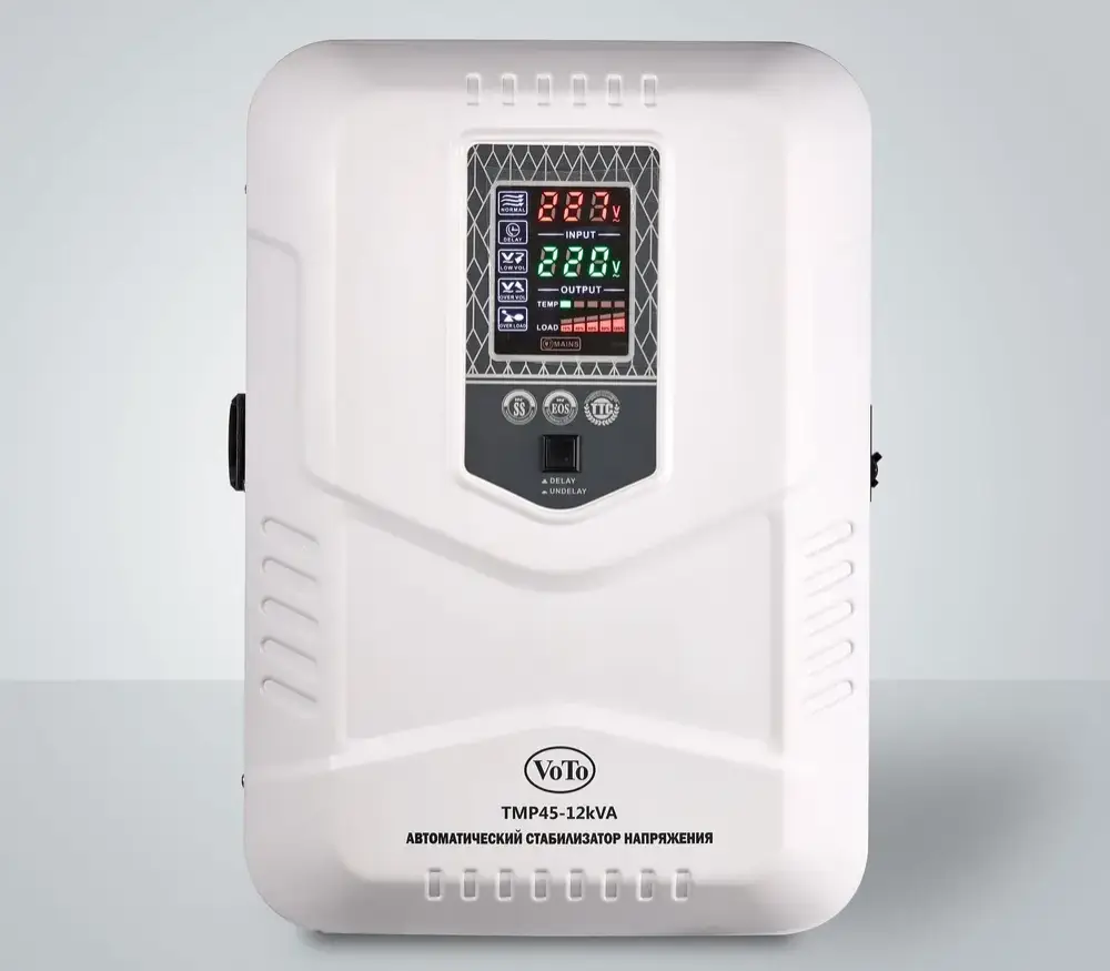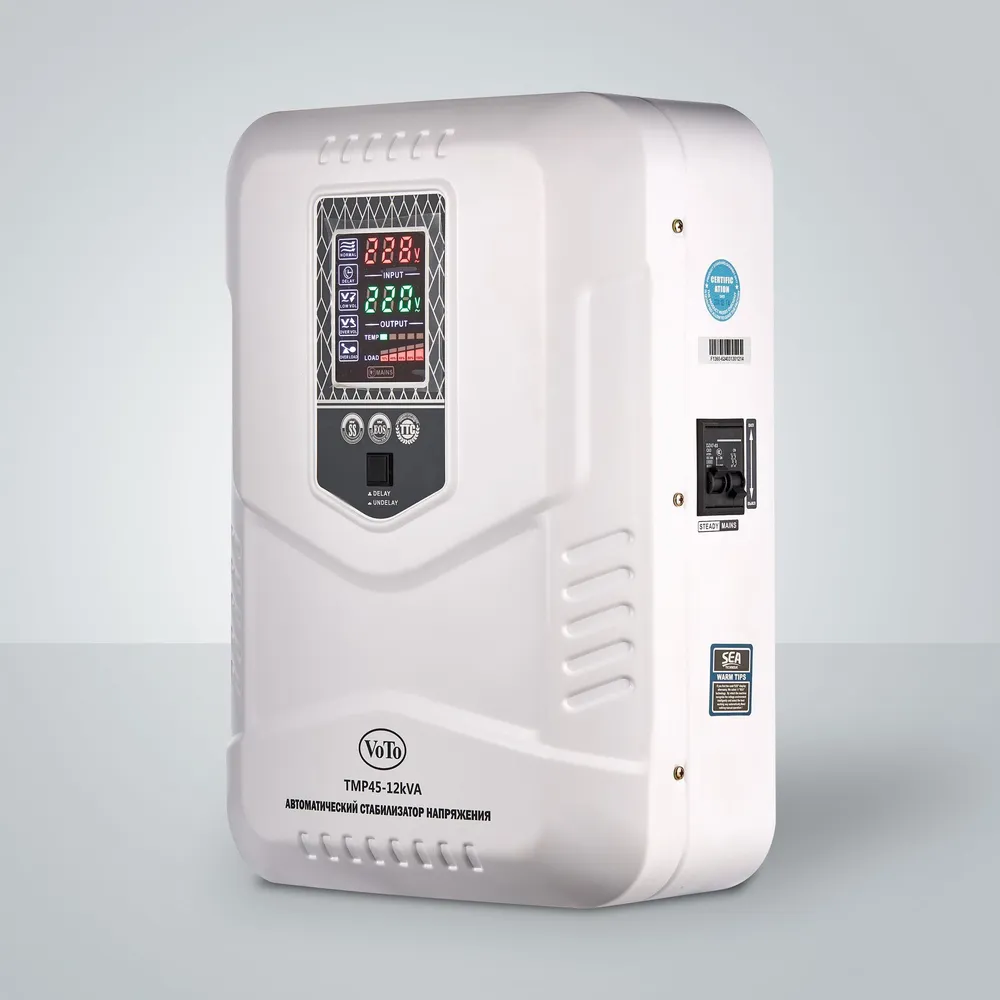 Автоматические стабилизаторы напряжения серии TMP представляют собой модели как для настольного, так и для настенного монтажа с лаконичным дизайном и информативным цифровым дисплеем. Тип напряжения: Однофазный Принцип стабилизации: Релейный Мощность: 12000 ВА Входное напряжение: 45 - 270 В Выходное напряжение: 220V ± 8% Частота: 50/60 Гц Трансформатор: тороидальный Тип дисплея: светодиодный цифровой дисплей (входное и выходное напряжение, избыточное и низкое напряжение, перегрузка, задержка, температура) КПД при полной нагрузке: 97% Задержка включения: короткий 3-5 сек, длинный 3-7 мин. Защита: от перенапряжения, перегрузки, высокой температуры, короткого замыкания Тип охлаждения: Воздушное (конвекционное и принудительное) Температура эксплуатации: -20...+55°С Относительная влажность: 90% Режим работы: Непрерывный Способ установки: Напольный, Настенный Цвет: Белый Отличаются высокой скоростью и широким диапазоном регулирования напряжения. Широко используются в различных отраслях промышленности и частного использования для защиты офисной и бытовой техники.