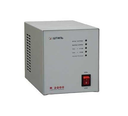 Однофазный стабилизатор переменного напряжения "Штиль" R 2000 является одним из наиболее популярных линейки стабилизаторов напряжения "Штиль" серии "Стандарт" (R). Конструктивно стабилизатор напряжения "Штиль" R 2000 выполнен в виде настольного блока с табло индикации и выключателем сети на передней панели, двумя розетками евростандарта и автоматическим предохранителем на задней, для подключения к сети имеется кабель с вилкой евростандарта. Назначение стабилизатора напряжения "Штиль" R 2000 - это защита бытовой, офисной и промышленной техники, суммарная электрическая мощность которой не превышает 2000 ВА (холодильники, телевизоры, СВЧ-печи, насосы, компьютеры, факсимильные аппараты, офисные АТС и т.д.). При подключении электродвигателей (имеются в составе холодильников, стиральных машин, насосов, компрессоров, моек высокого давления, электроинструмента) с прямым пуском стабилизатор напряжения должен иметь минимум полуторо...трехкратный запас по мощности относительно мощности электродвигателя. Технические характеристики Число фаз 1 Максимальная мощность нагрузки, кВА 2 Допустимая перегрузка 200% - 2 с, 100% - 15 с Рабочий диапазон входного фазного напряжения, В 175-260 Предельный диапазон входного фазного напряжения, В 135-275 Номинальная входная частота, Гц 50 Диапазон входной частоты, Гц 48-52 Стабилизация выходного фазного напряжения, % ±5,5 Рабочий диапазон выходного фазного напряжения, В 208-232 Предельный диапазон выходного фазного напряжения, В 180-242 Допустимый коэффициент амплитуды кривой переменного тока нагрузки (пик-фактор) не нормируется Число уровней коррекции 7 КПД, % 95 Диапазон изменения нагрузки, % 0...100 Коэффициент мощности нагрузки 0-1 Тип ключей реле Время регулирования напряжения одного уровня коррекции, мс <=200 Защита от перегрузки и КЗ электронная и автоматический выключатель Фильтр EMI/RFI выходной Климатическое исполнение УХЛ 4.2 по ГОСТ 15150 Диапазон температуры окружающей среды, °С +1...+40 Относительная влажность воздуха, % 0...80 Вид охлаждения естественное Степень защиты IP20 Устойчивость к механическим воздействиям М1 по ГОСТ 17516.1 Масса, кг 10 Габаритные размеры (ШхВхГ), мм 155 x 185 x 300 Габаритные размеры в упаковке (ШхВхГ), мм 170 х 200 х 305 Гарантийный срок, мес 12 Срок службы, лет 10 Конструктивные особенности однофазных стабилизаторов напряжения "Штиль" мощностью 400...2000 ВА серии R: настольный корпус; тороидальный силовой автотрансформатор; естественное охлаждение (без вентилятора); дискретное (ступенчатое) регулирование выходного напряжения; широкий диапазон входного напряжения; высокая перегрузочная способность; релейные силовые ключи; высокое быстродействие; электронная защита от короткого замыкания и перегрузки с автоматическим отключением; возможность работы стабилизатора на заявленную мощность нагрузки во всём предельном диапазоне входного напряжения; автоматическое отключение нагрузки при выходе входного или выходного напряжения за установленный предельный диапазон с последующим автоматическим включением после возвращения напряжения в рамки предельного диапазона; выходной фильтр высокочастотных сетевых помех; светодиодная индикация режимов работы; две розетки евростандарта для подключения нагрузки, шнур с вилкой евростандарта для подключения к сети.