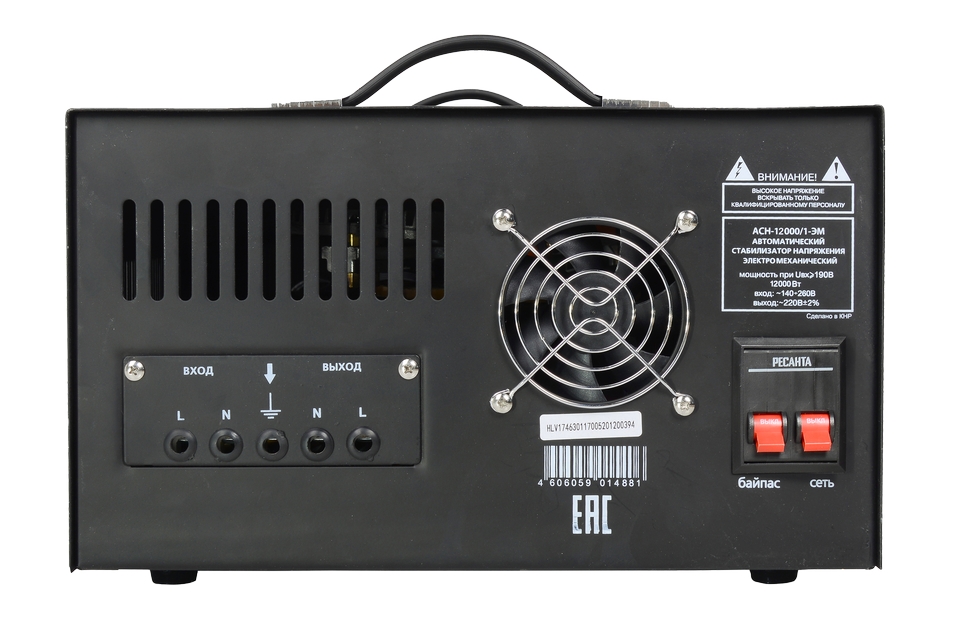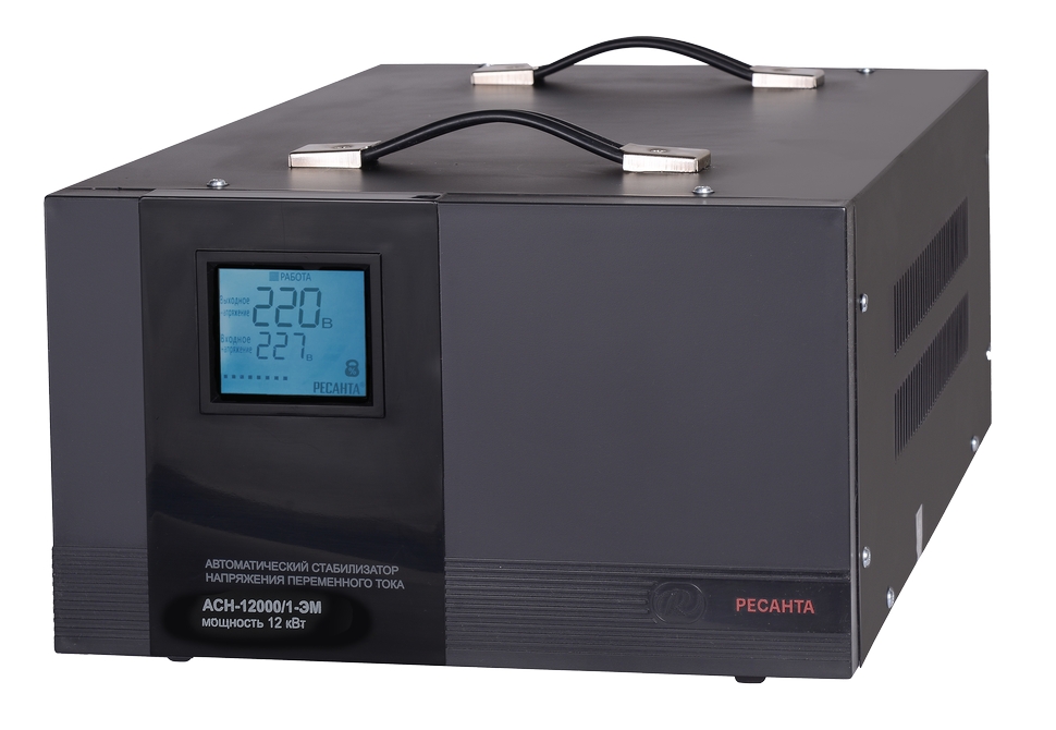 Стабилизатор напряжения РЕСАНТА АСН-12000/1-ЭМ электромеханического типа предназначен для выравнивания входного напряжения и защиты приборов от перепадов напряжения с суммарной мощностью до 12 кВт. Работает с напряжением 220В с точностью до +/-2%. Устройство оснащено фильтрами сетевых помех, предотвращающими искажение частотной синусоиды, микропроцессорным управлением и дисплеем, отображающим параметры напряжения. Превышение пределов поддерживаемого входного напряжения автоматически отключает подачу питания. Прочный корпус защищает внутренние узлы аппарата от повреждений. Прибор может обеспечивать стабильным питанием - телевизор, ресивер, DVD проигрыватель, кассовый аппарат, газовый котел. Серия: АСН Тип напряжения: Однофазное (220 В) Принцип работы: Электромеханический Максимальная мощность, Вт: 12000 Максимальный ток, А: 63,2 Диапазон входного напряжения, В: 140-260 Точность стабилизации, %: 2 Высоковольтная защита, В: 245±5 Номинальная величина выходного напряжения, В: 220±2% Скорость стабилизации, В/с: 40 Искажение синусоиды: отсутствует Рабочая частота, Гц: 50 Рабочая температура, °C: -5 40 Размещение: Напольное Класс защиты: IP20 КПД, %: 97 Защита: от короткого замыкания, от перегрева, от повышенного напряжения Влажность воздуха, %: 80 Габариты упаковки: 0.495×0.27×0.39 м Вес, кг: 26.99 кг Данный стабилизатор обеспечивает самую точную регулировку напряжения (погрешность до 2%) за счет считывания напряжения с каждого витка катушки. Номинальная мощность при входящем напряжении 190В составляет 12000Вт. Количество фаз = 1. Размещение напольное. Системы защиты: Защита от выхода напряжения за пределы рабочего диапазона стабилизатора (рабочий диапазон стабилизатора от 140 до 260 В). Термозащита (тепловая защита) позволяет выключиться стабилизатору при превышении его мощности нагрузки над мощностью самого устройства. Преимущества: Встроенные фильтры входных и выходных частотных помех. Автоматическое отключение питания при превышении предельного значения напряжения. Широкий диапазон поддерживаемого входного напряжения. При кратковременных перегрузках прибор не выключается. Автоматическое включение при выравнивании напряжения в пределах рабочего диапазона. Микропроцессорное управление. Компактные габариты. Высокая скорость срабатывания защиты.