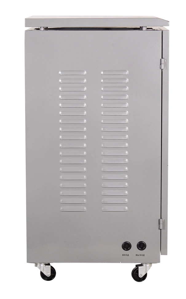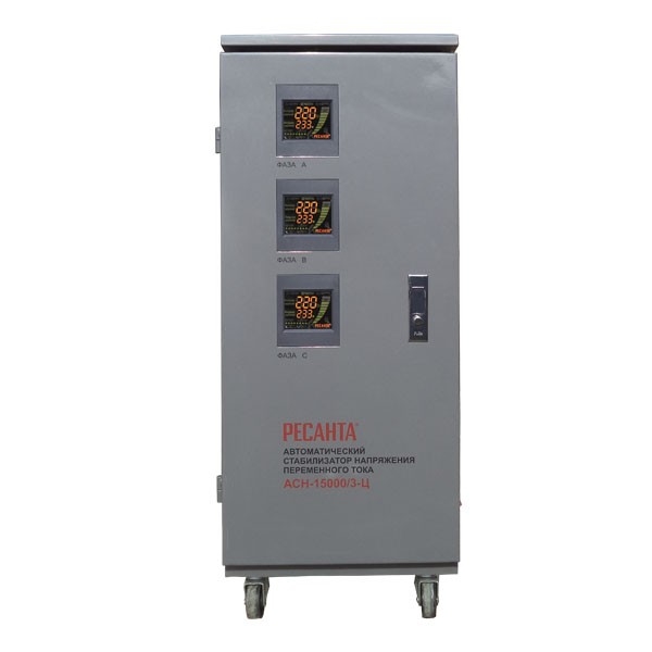 Стабилизатор напряжения Ресанта АСН 15000/3-Ц предназначен для стабилизации напряжения в трехфазной электросети. Управляющий модуль реагирует на колебания параметров сети менее чем за 15 м/сек. Модель оптимальна для использования при стабильно пониженном или повышенном напряжении. Диапазон входного напряжения, В: 240-450 Номинальная величина выходного напряжения, В: 380±8% Рабочая частота, Гц: 50/60 КПД, %: 97 Время регулирования: Менее 15 мс Искажение синусоиды: Отсутствует Высоковольтная защита, В: 260±5 Класс защиты: IP20 Максимальная мощность, Вт: 15000 Максимальный ток, А: 22А (на каждую фазу) Тип расположения: Релейный Серия: АСН Тип напряжения: Трехфазное (380 В) Размещение: Напольное Охлаждение: Принудительное Влажность воздуха, %: 80 Точность стабилизации, %: 8 Рабочая температура, °C: -5 45 Защита: от короткого замыкания, от перегрева, от повышенного напряжения, от помехВес, кг: 49.84 кг Бренд: Ресанта Габариты упаковки: 0.405 × 0.885 × 0.515 м Ресанта АСН 15000/3-Ц спроектирована на базе 3 однофазных автоматических трансформаторов с номинальными значениями напряжения на входе от 140 до 260 В. Выходное напряжение регулируется дискретным способом и поддерживается на уровне 380 В для линейного и 220 В для фазного с точностью ± 8%. Частотная синусоида не искажается. Уровень нагрузки потребителей при Uвх = 190 В не превышает 15 кВт, максимальная допустимая сила тока на каждую фазу - 22 А. Напольный стабилизатор напряжения имеет колесики для удобства транспортировки. Информация о работе прибора выводится на цифровые дисплеи: показания вольтметра для каждой фазы, уровень нагрузки и другие индикаторы состояния. Предусмотрены защиты от перегрева, перегрузки, высоковольтных скачков, короткого замыкания, выхода напряжения за предельные нормированные значения, обрыва фазы и нуля.