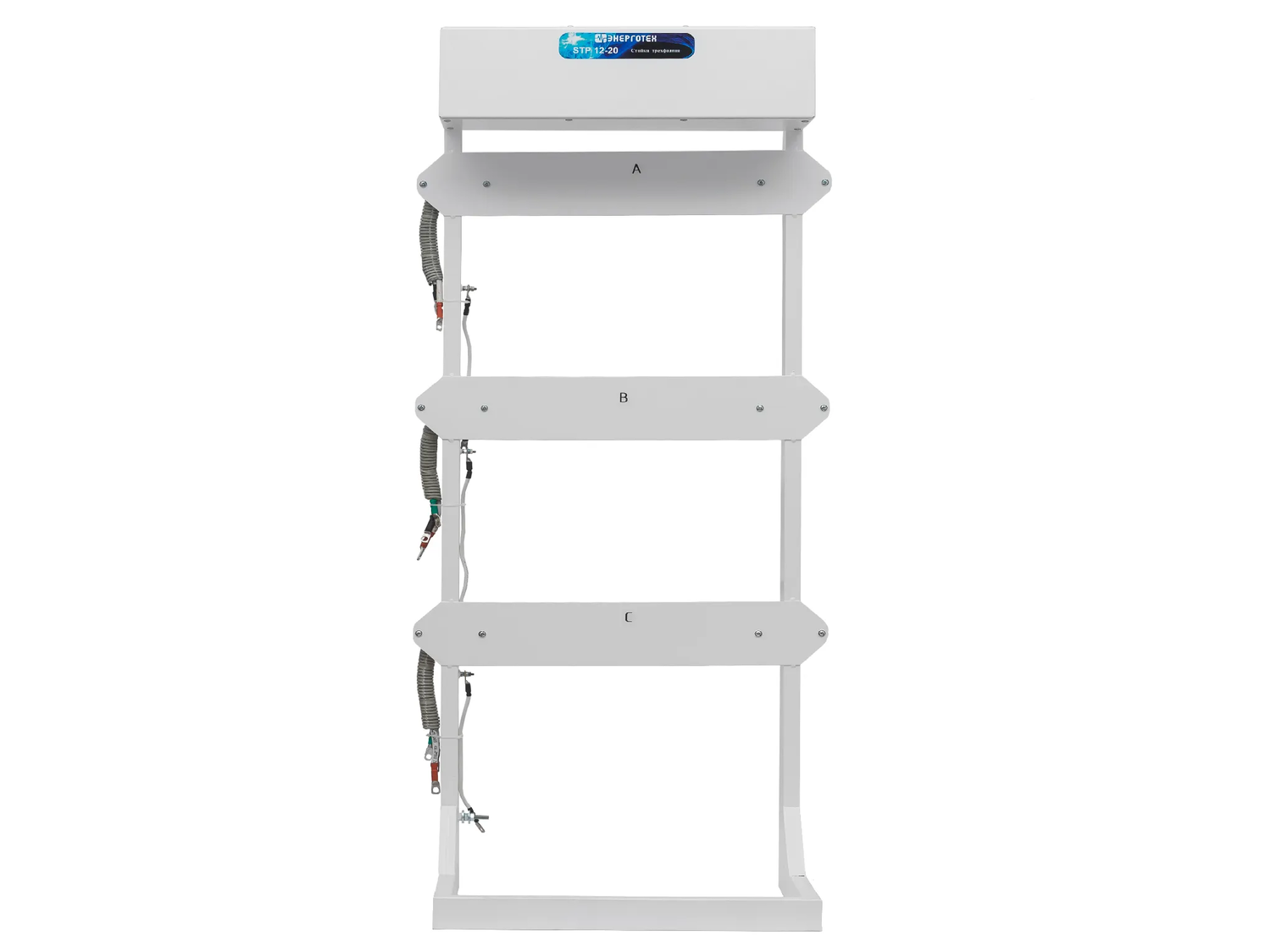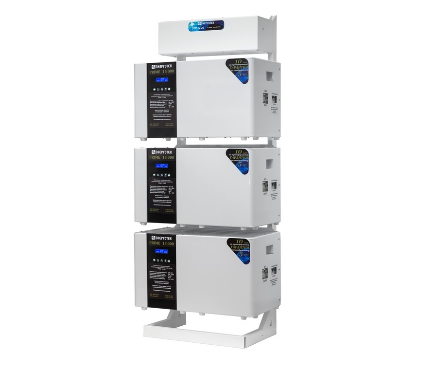 Стойка трехфазная STP, предназначена для объединения трех однофазных стабилизаторов напряжения TOP или PRIME. Масса не более 23 кг Габариты 350х600х1500 мм ( ГхШхВ ) Стойка STP предназначена для объединения трех однофазных стабилизаторов напряжения TOP или PRIME. Имеет устойчивое положение на горизонтальной поверхности. На стойке предусмотрены отверстия для крепления к вертикальной плоскости (стены либо окна), для обеспечения дополнительной устойчивости и надежной неподвижности конструкции. В верхней части Стойки STP расположен блок коммутации. Задняя крышка блока закрывает клеммные колодки, служащие для подсоединение подводящих и отходящих проводов. Стойка STP не обеспечивает отключение трехфазной нагрузки при пропадании напряжения на одной из фаз. Поэтому при необходимости подключения такой нагрузки она должна быть дополнительно защищена от неполнофазного режима. При необходимости осуществления обслуживания, ремонта или замены одного из стабилизаторов стойку следует полностью обесточить. После этого можно отключить стабилизатор и заменить его исправным. При отсутствии стабилизатора для замены допустимо надежно соединить (скрутить винтом с шайбами и гайкой на М5 или М6) клеммы проводов Фаза Вход и Фаза Выход (красный и желтый или зеленый) выходящие из стойки около стабилизатора, подлежащего демонтажу. После чего место соединения следует надежно заизолировать и отдельно заизолировать клемму Ноль (синяя или черная). Убедившись, что соединения выполнены правильно, а изоляция надежна, можно подключить стойку к сети. Таким образом при необходимости, можно обеспечить работу стойки без одного из стабилизаторов. Стойка обеспечивает: удобный и компактный монтаж стабилизаторов ; быстрое подключение, возможность оперативной замены любого стабилизатора, либо отключение для осуществления ремонта в сервисном центре ; бесперебойную работу однофазных нагрузок, при пропадании напряжения на соседней фазе; возможность, при необходимости, объединения стабилизаторов разной мощности и точности;