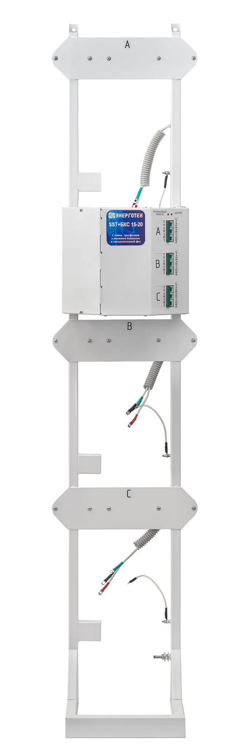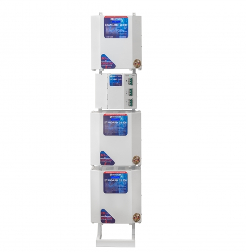 Стойка к однофазным стабилизаторам напряжения серии Optimum+, Standard, Infinity, Universal мощностью от 12 до 20 кВА с блоком контроля 3х фазной сети и ручным по фазным байпасом (БКС+БС) для получения трехфазного стабилизатора общей мощностью 36-60 кВА. Масса: 19 кг Габариты, (ГхШхВ): 300х385х1800 мм Стойка трехфазная с внешним байпасом и синхронизацией фаз SST+БКС (в дальнейшем, Стойка SST+БКС), предназначена для объединения трех однофазных стабилизаторов напряжения STANDARD, OPTIMUM+, UNIVERSAL и INFINITY для работы в трехфазном режиме. Стойка обеспечивает: удобный и компактный монтаж стабилизаторов ; быстрое подключение, возможность оперативной замены любого стабилизатора, либо отключение для осуществления ремонта в сервисном центре ; время обесточенного состояния нагрузки при использовании внешнего байпаса не более 1 минуты; защиту от пропадания, асимметрии и нарушения порядка чередования фаз для трехфазных нагрузок; бесперебойную работу однофазных нагрузок, при пропадании напряжения на соседней фазе; возможность, при необходимости, объединения стабилизаторов разной мощности и точности; задержку на отключение трехфазной нагрузки после пропадания напряжения на одной из фаз 3 секунды; задержку на включение трехфазной нагрузки после восстановления напряжения на всех трех фазах 5 секунд; защиту трехфазной нагрузки в режиме транзит от выхода напряжения за границы диапазона 180 260 В;