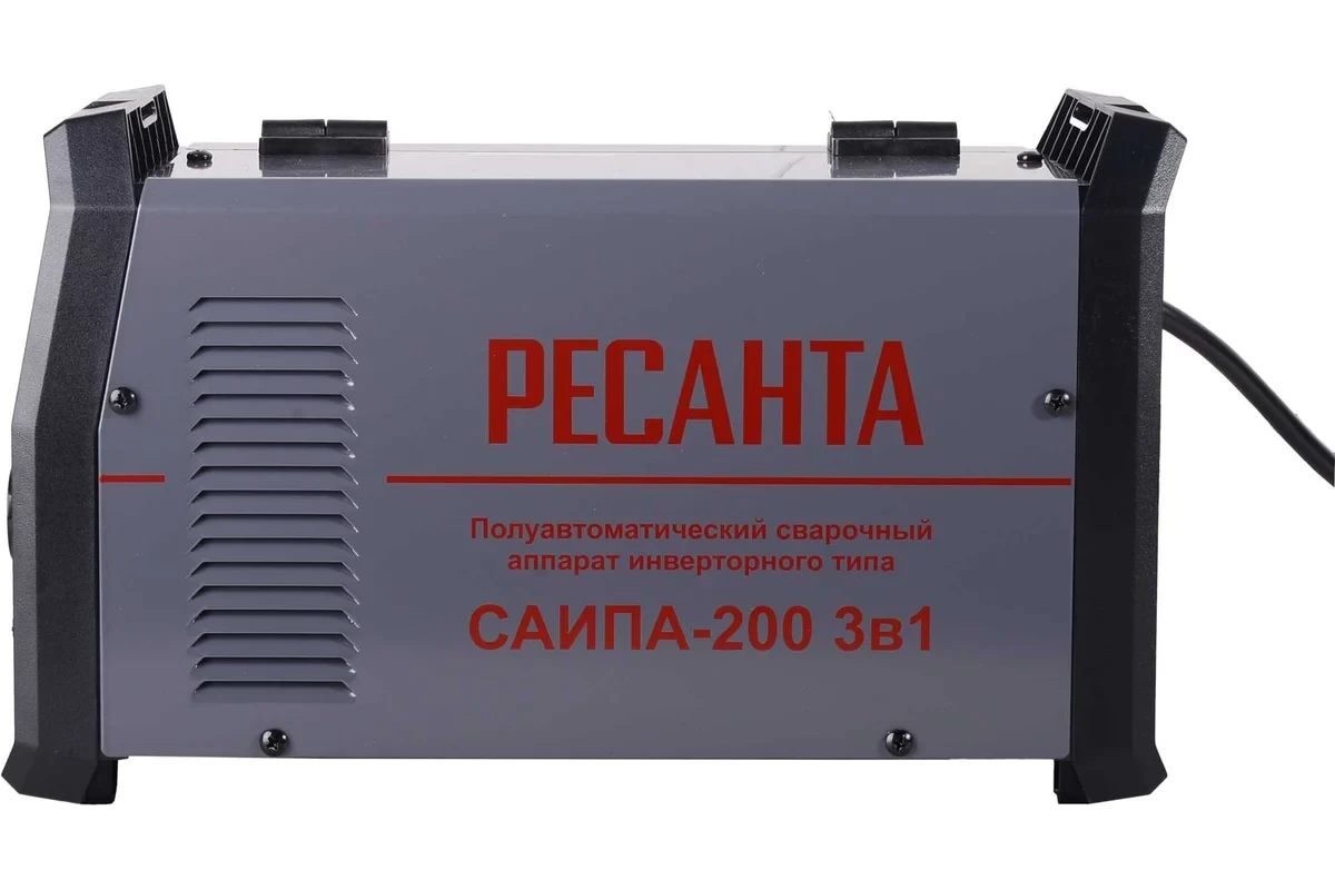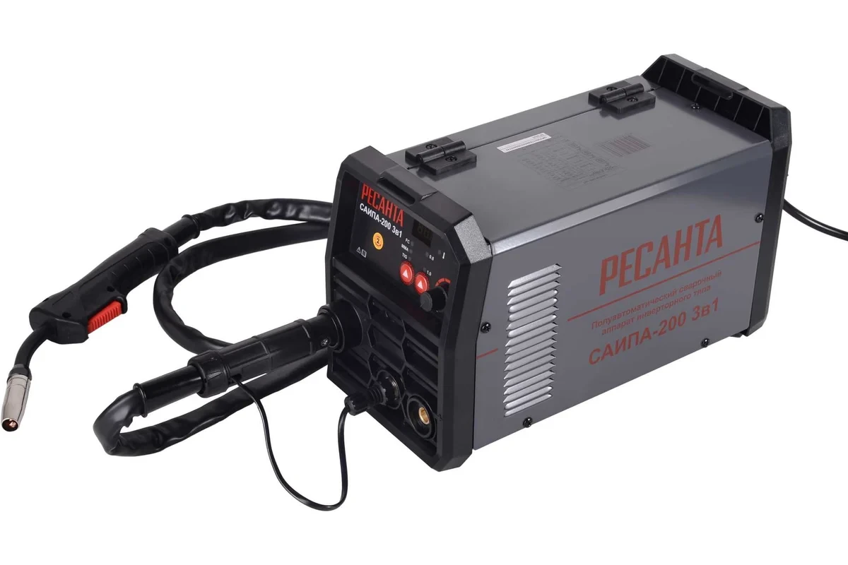 Сварочный полуавтомат САИПА-200 3в1 Ресанта предназначен для профессиональных и бытовых сварочных работ различной сложности. Модель сочетает в себе три универсальных режима сварки: ручной (MMA), порошковой проволокой (FCAW) и аргоновой (TIG Lift). Тип питающей сети: Однофазная Напряжение питающей сети: 220 230 В Частота сети: 50 Гц Возможный режим работы: TIG, MMA, FCAW Рабочее напряжение: 140 270 В Максимальная потребляемая мощность (FCAW): 5.6 кВт Максимальный ток потребления (FCAW): 25.8 А Диапазон регулирования сварочного тока в режиме FCAW (Flux): 30 200 А Диапазон регулирования сварочного тока в режиме ММА: 15 200 А Диапазон регулирования сварочного тока в режиме TIG: 15 200 А Продолжительность нагрузки: 70% Напряжение холостого хода: 14 В / 80 В Диаметр сварочной проволоки: 0,8-1 Сварка порошковой проволокой: Да Режим сварки ММА: Да Длина проводов: Кабель с клеммой заземления 1,3 м Максимальный диаметр электрода MMA: 5 мм Подающий механизм: Встроенный Масса катушки: 1 кг Функция ArcForce (форсаж дуги): Автоматический Функция Hot Start (горячий старт): Автоматический Функция Antistick (антизалипание): Автоматический Класс изоляции: F Класс защиты: IP21S Рабочая температура: -20 50 °C Сварочная горелка: Съемная 2м Кабель заземления: 1.3 м Комплектация: Паспорт изделия, Кабель с электрододержателем, Кабель с клеммой заземления, Кабель с горелкой, Наконечники, Ролики Особое внимание заслуживает функциональность оборудования, рассчитанная на работу с разными материалами и условиями эксплуатации. Например, технология Anti-Stick предотвращает прилипание электрода к поверхности металла, а функция Hot Start обеспечивает стабильное начало процесса сварки. Функция Arc Force гарантирует устойчивую дугу, предотвращающую разрыв цепи, делая процесс плавным и эффективным. Аппарат способен работать с электродом диаметром до 5 мм и со сварочной проволокой 0.8 1 мм. Полуавтомат оснащен встроенным подающим механизмом проволоки, что существенно улучшает эксплуатационные качества инструмента. Такой конструктивный элемент обеспечивает точное и ровное продвижение сварочной проволоки к месту контакта, поддерживая постоянную скорость подачи материала независимо от нагрузки. Встроенная конструкция механизма уменьшает габариты устройства, увеличивает его мобильность и снижает вес, одновременно повышая общую безопасность и надежность работы. Конструкция поддерживает катушки весом до 1 кг. Аппарат способен стабильно функционировать при низком входящем напряжении сети от 140 В, что актуально для регионов с нестабильной подачей электроэнергии. Удобство управления обеспечивают цифровой дисплей и интуитивно понятная панель настройки режимов, позволяющая точно регулировать важные параметры. Удобный эргономичный дизайн дополняют удобные ручки и ремешки для переноски. Аппарат отличается небольшими габаритами и весом всего около 5,61 кг, что облегчает транспортировку и установку оборудования на рабочем месте. Такие компактные размеры достигаются за счет изготовления по современной IGBT-технологии. Комплектация включает следующие элементы: Сварочную горелку длиной 2 м, обеспечивающую удобную и точную работу при выполнении сварочных операций. Кабель заземления длиной 1,3 м, предназначенный для надежного соединения с землей и безопасного подключения аппарата. Кабель с электрододержателем длиной 1,5 м, позволяющий надежно удержива
